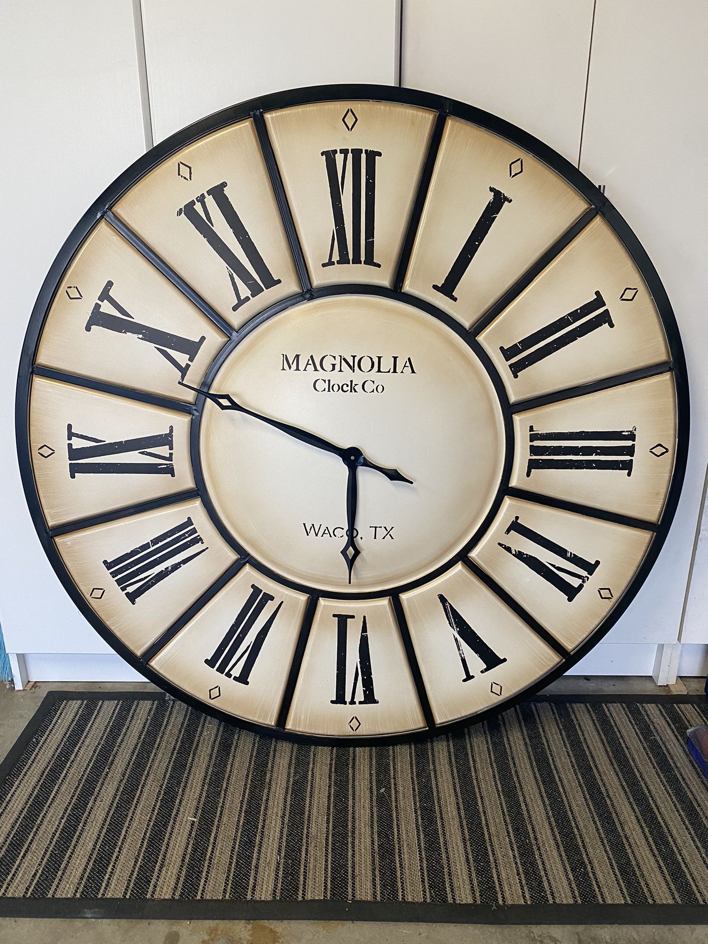 Large wall clock by Magnolia Home 47” diameter/across Very good condition Keeps perfect time Paid $329.00 Asking $150.00 OBO