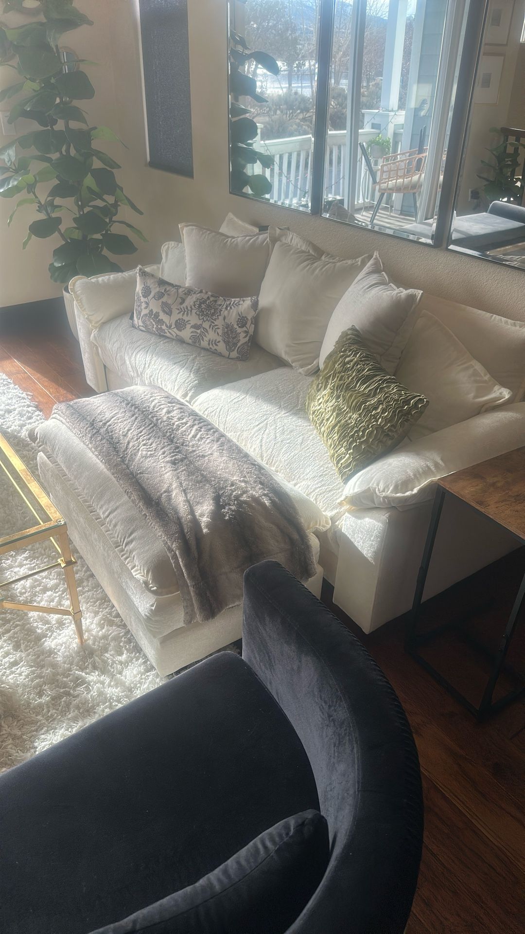Perfect couch for small living room. Throw pillows and blankets not incl. Scotch guarded. In great condition. Machine washable. Ottoman included!