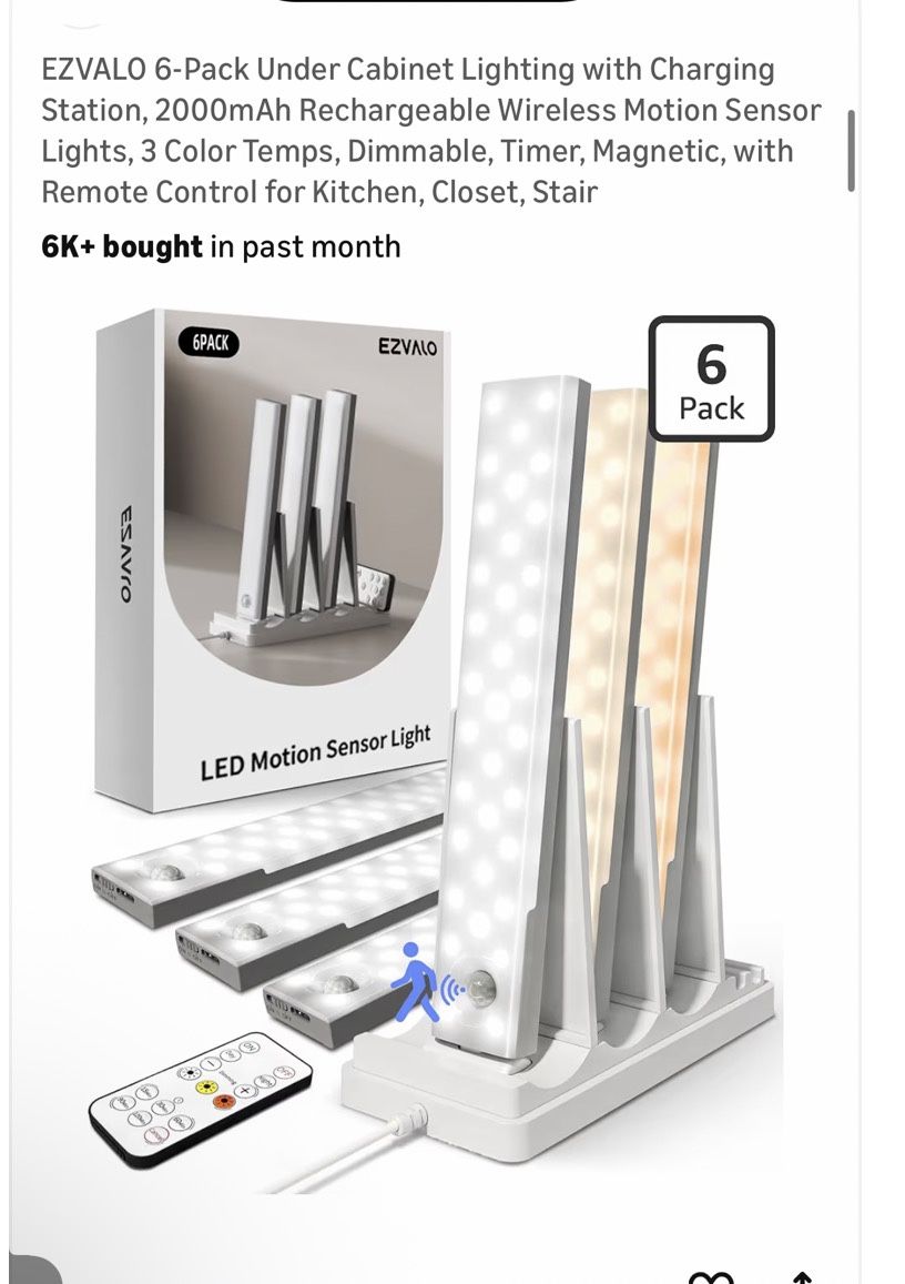 EZVALO 6-Pack Under Cabinet Lighting with Charging Station, 2000mAh Rechargeable Wireless Motion Sensor Lights, 3 Color Temps, Dimmable, Timer, Magnetic, with Remote Control for Kitchen, Closet, Stair