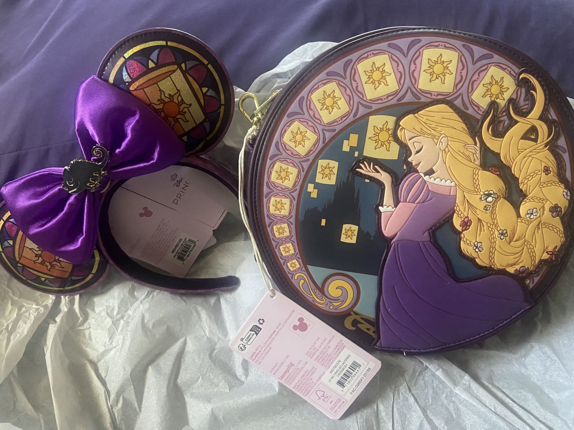 Rapunzel Loungefly Crossbody + Rapunzel stained glass ears + micro sequin Rapunzel backpack