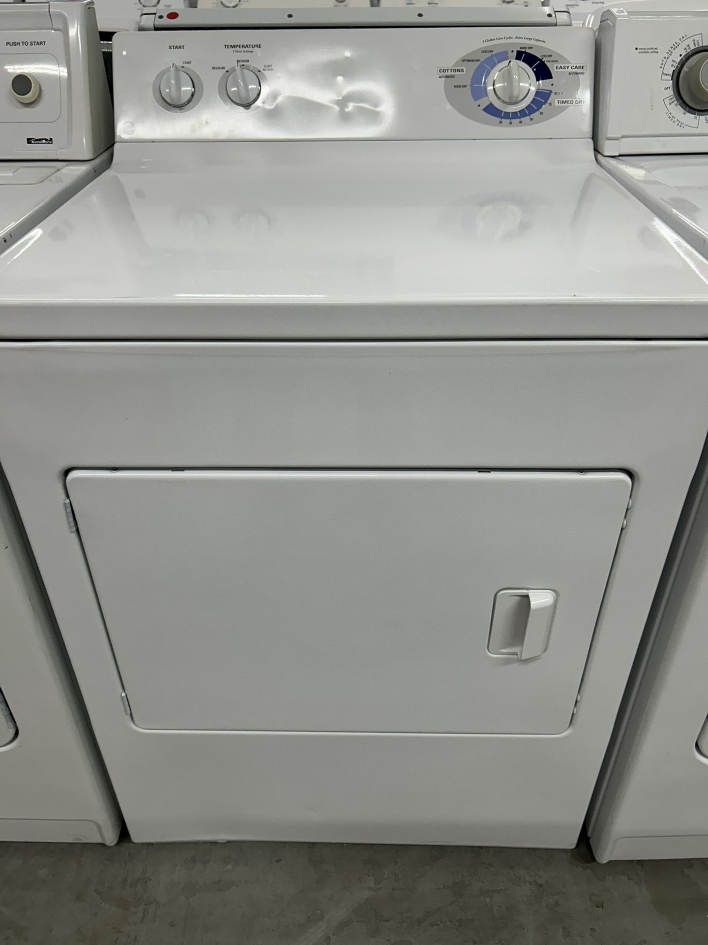 We have a GE heavy duty extra large capacity dryer for sale. Dryer has 3 cycles 3 fabric care temperatures and reversible side swing door. Comes with warranty. Financing and delivery available. Questions please call three two one (contact info removed).
