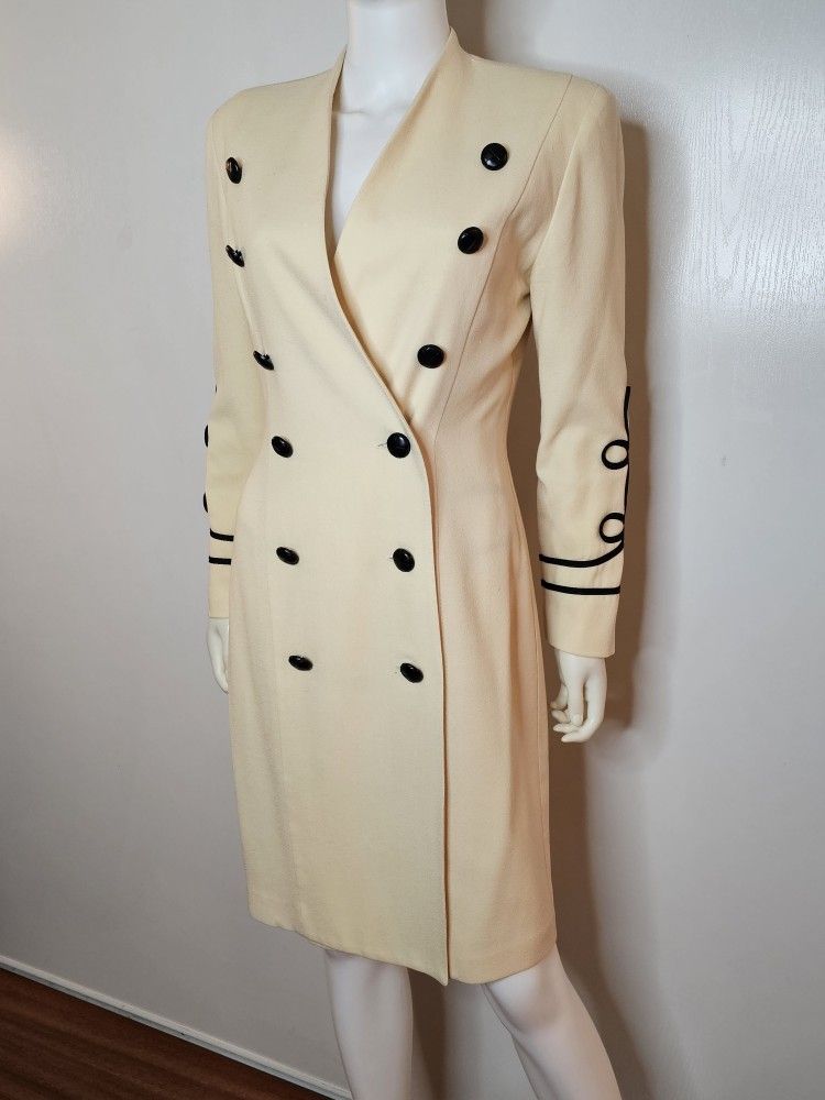 This elegant cream double-breasted women's dress features stylish black button accents and intricate sleeve detailing. Perfect for adding a touch of sophistication to aby wardrobe. In great condition and has been professionally dry cleaned. See all photos. Does have a small mark.
