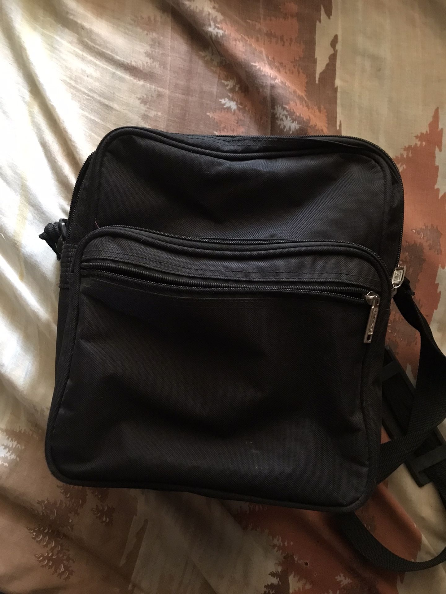 Bag, mens/woman’s, has handle on top and strap for shoulder, guys can use it as a survival bag, woman can use as makeup, diaper bag, purse, work carry on plane, it is 1ft tall, 10 1/2 inches long, 7 1/2 inches wide, it has two big pockets, two small pockets, small laptop, tablet, phone, ect would fit it, see pictures, price firm, cash only, Alma pick up, fcfs