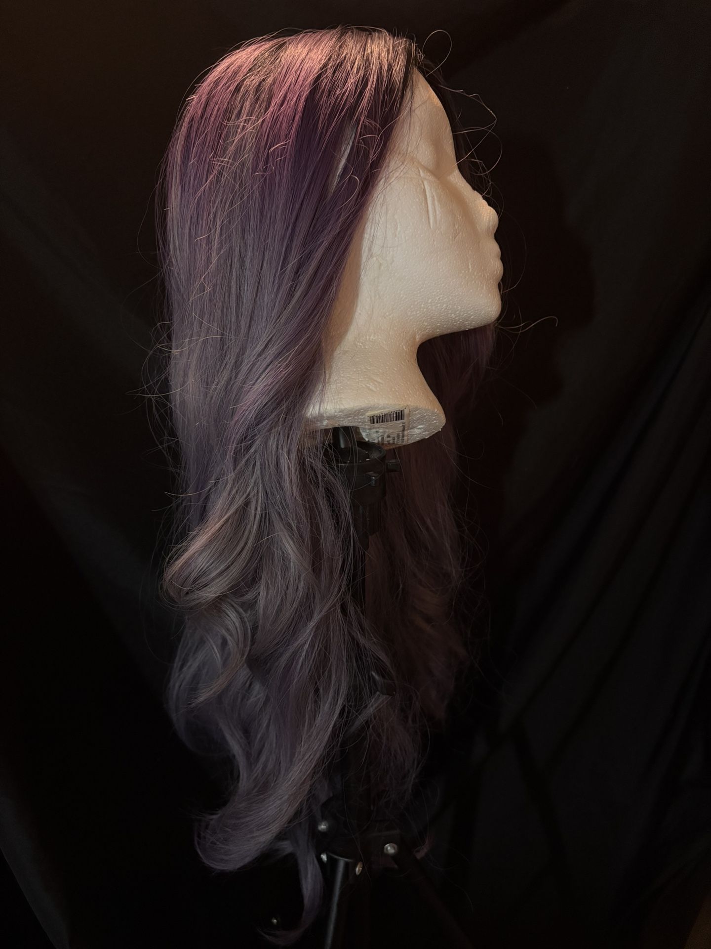 20” synthetic purple ombré wig. Dark to light. Center part heat resistant natural looking hair. . Comes with cap.