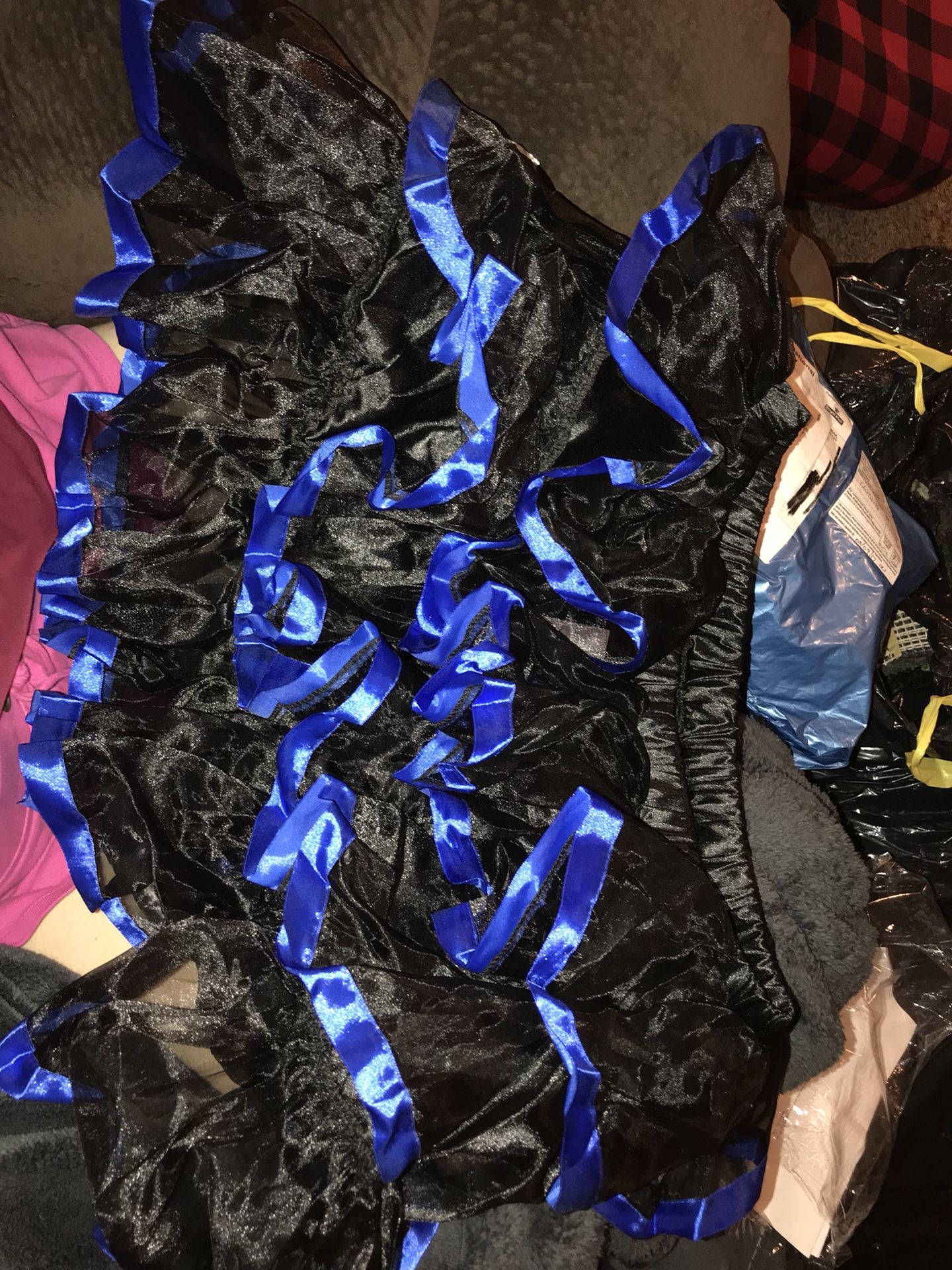 Good for Halloween. Was just taken out of package to take these pictures other than that never used. It says it’s a 5/6XL but it has a scrunchy waist band.