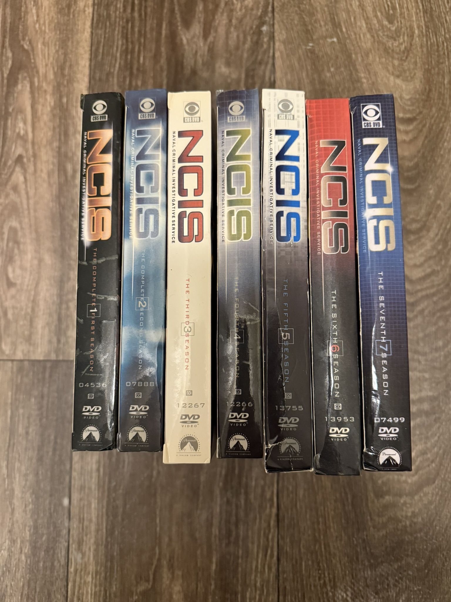 The product is several pre-owned DVD box sets of the TV series "NCIS: Naval Criminal Investigative Service" seasons 1-7. The show falls under the genres of TV action & adventure and TV crime/ investigation, with a runtime of 4128 minutes. It features both Spanish and English language options and has a rating of NR. Produced by Avery C. Drewe, David Bellisario, Jeffrey Vlaming, and Mark Schilz, this box set from Paramount includes all seven seasons of the popular NCIS series.