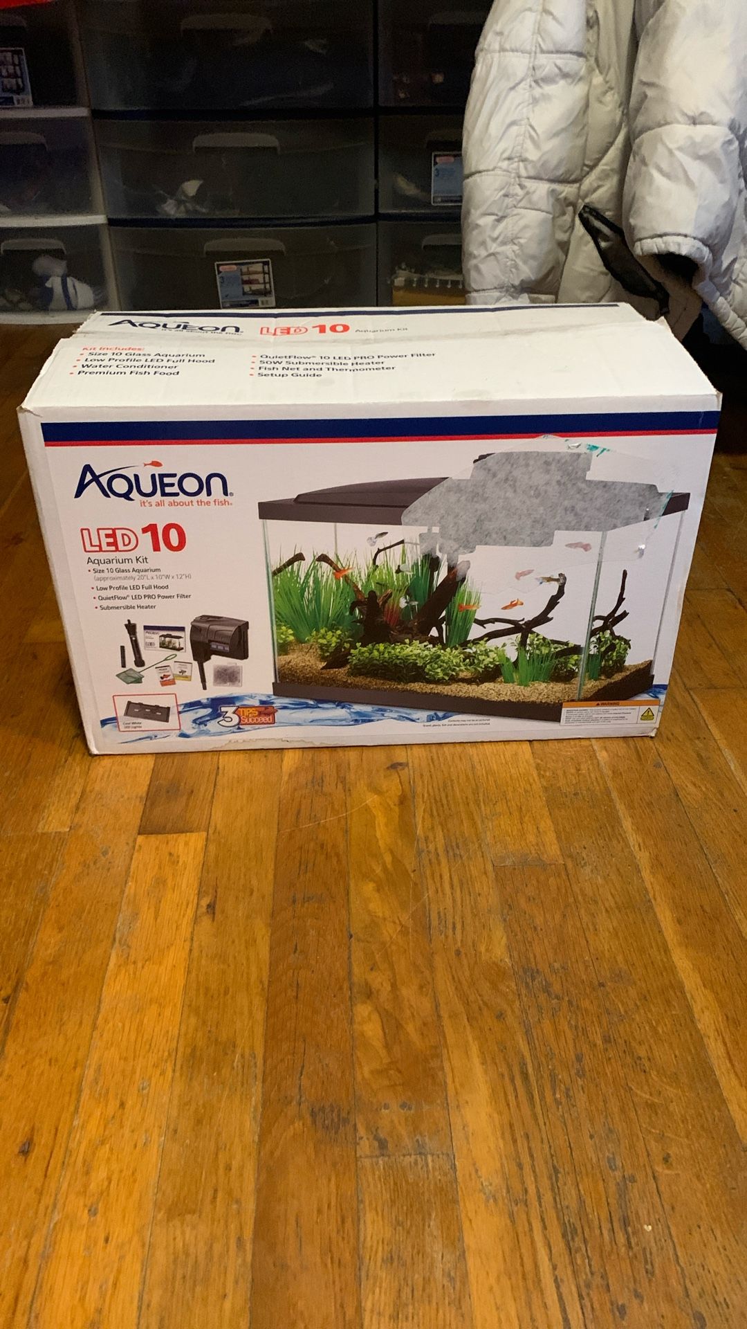 10 gallon fish tank with everything needed including filter,light, stones,tank decorations,net,extra filters,fish food and water treatment chemicals
