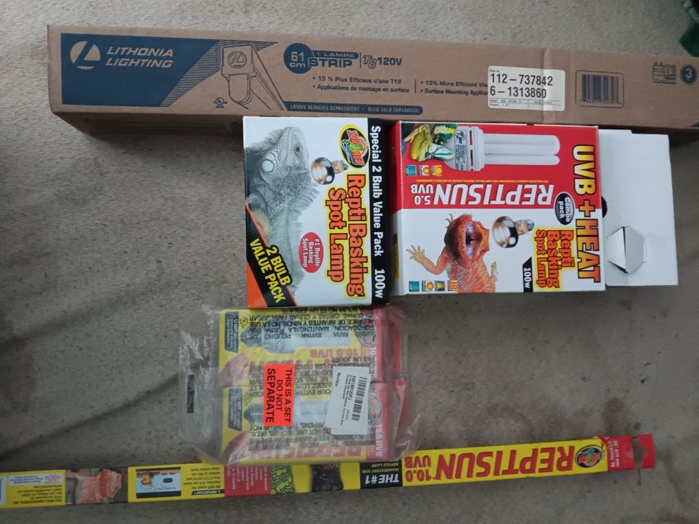 A variety of basking and UVB lights that were intended for a bearded dragon but he passed away so I have no need for them anymore. Some of them are still sealed and have never been opened, some have been opened but never used, and the box with the combo of a basking light and a UVB light, one bulb out of the box is not in there since I used it but the other one hasn't been used at all. That box is only $5, the rest are $10 or $15 each, depending on which one you're wanting. If you want them all, you will get a discount and the total cost will be $35. I also have the lamps, terrariums/enclosures for reptiles that I think are 40 or 60 gallon, and a few other supplies for reptiles. Message me if you have any questions and have a good day