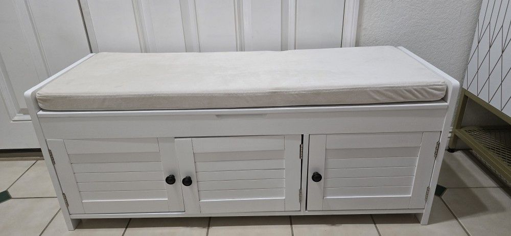 43.5 in. W x 16 in. D x 18 in. H White Storage Bench Linen Cabinet with 3-Doors and Adjustable Shelf