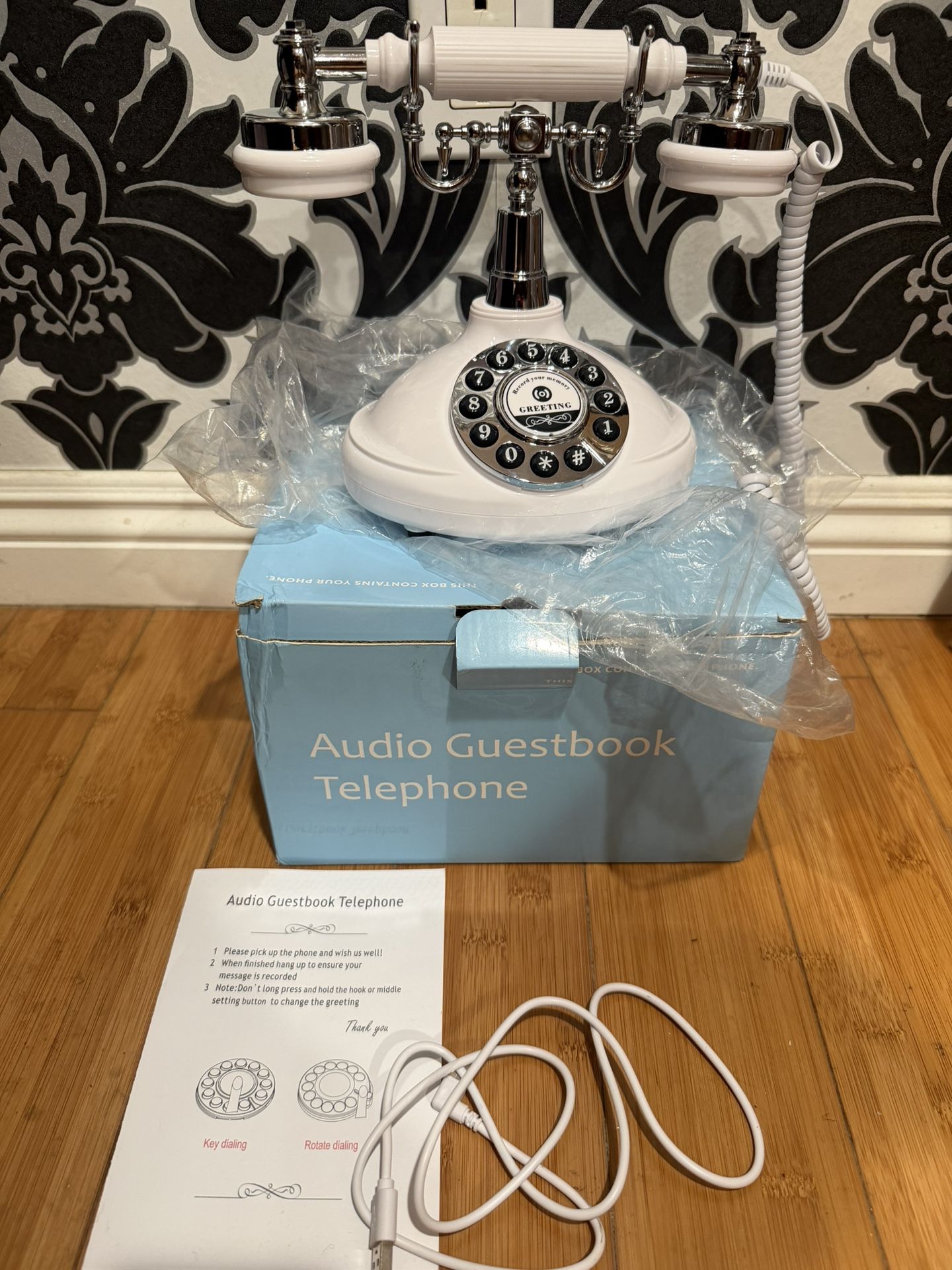 Only used once Looks brand new still have the box, instructions, and all the wires. It is battery operated (3AA batteries) Perfect for weddings or 15/16’s You can record your own voicemail message that guest will hear before they leave their message.