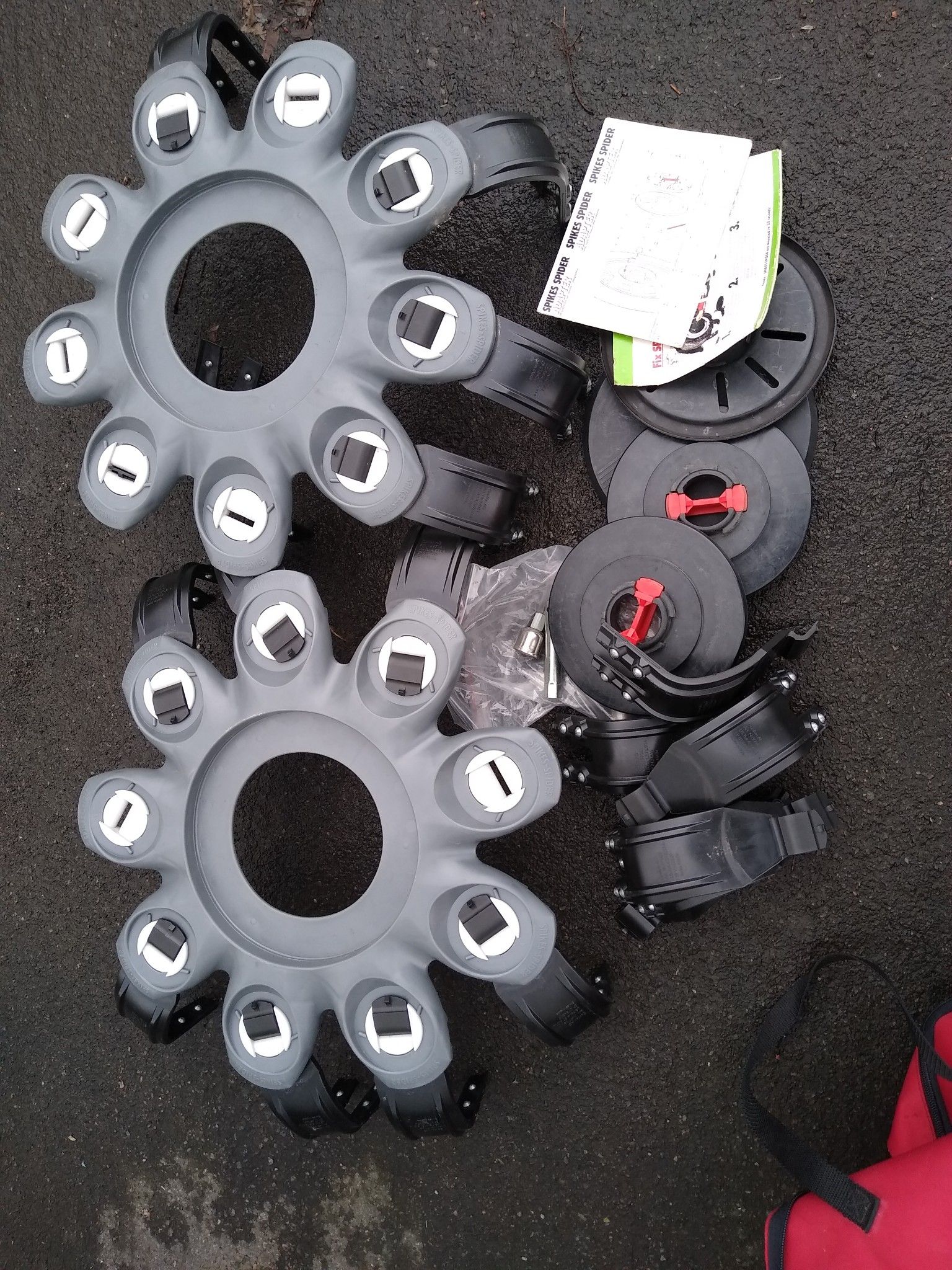 I bought these used and never had the chance to use them. The "spikes" are all there and there is no damage to them. They do have a fair amount of wear but no damage such as cracks. There is a bag of hardware included but since I've never installed them I'm not sure if it's all complete or not.