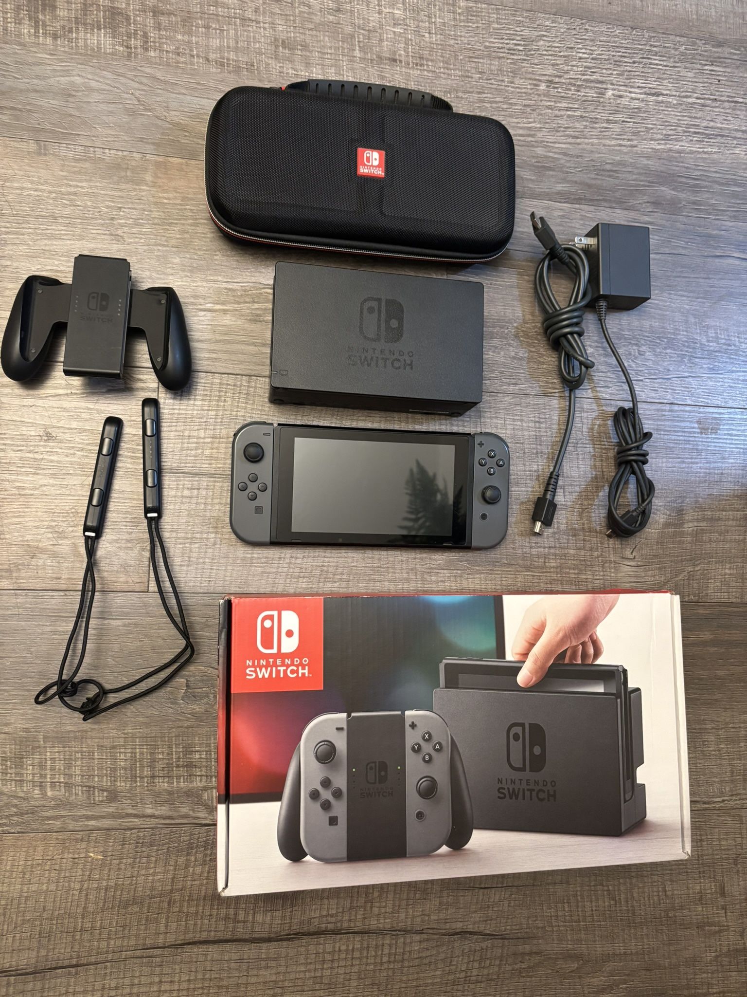 Comes with everything you see in the photo. The joy-cons do drift but besides that everything else works great. Firm on price.