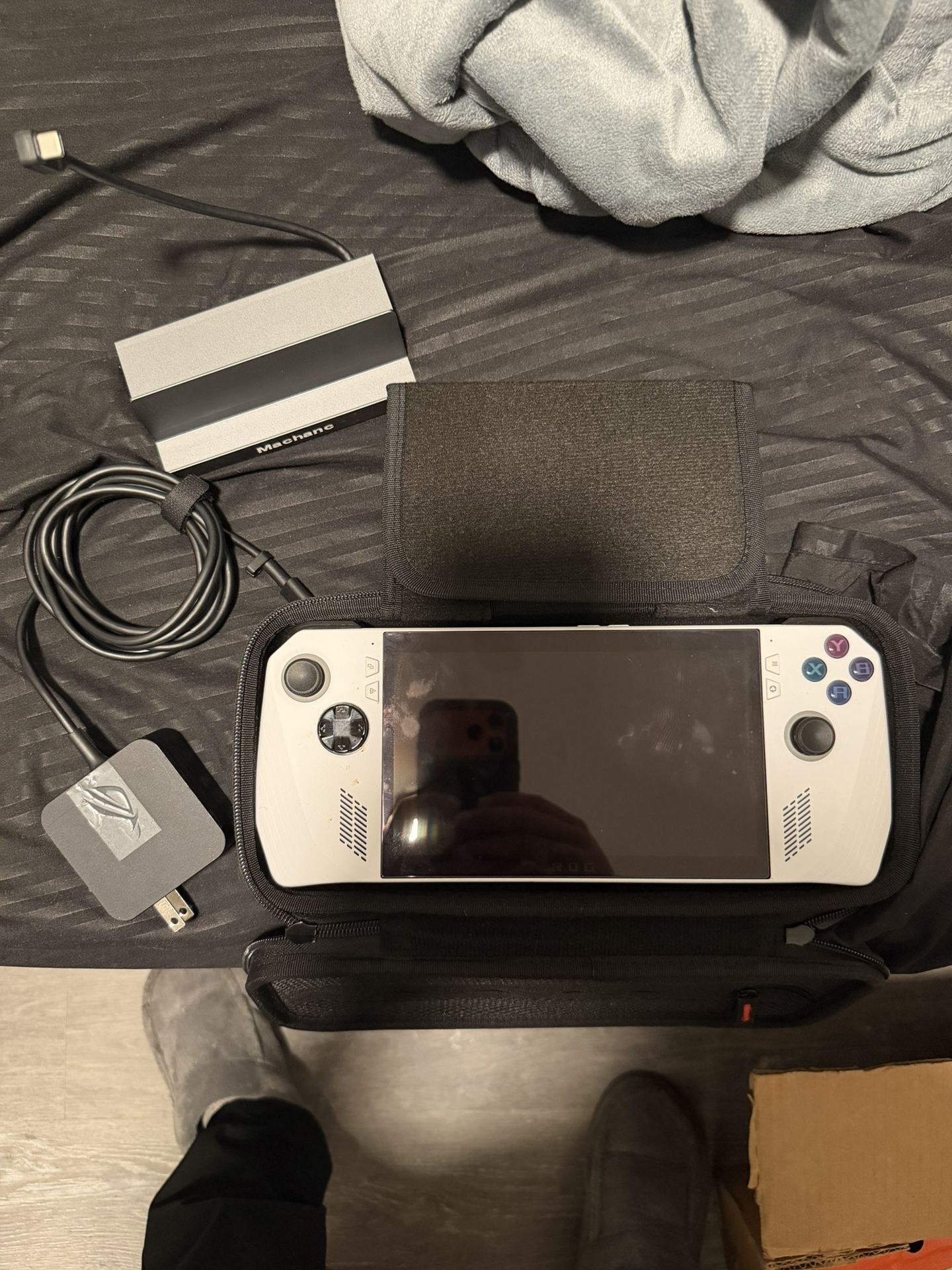 ROG ALLY reg. version (350$) - Cool handheld PC, fully windows capable. Play any game from PC, XBOX, or PlayStation as well as dock it to use as a full blown PC setup with its own external monitor. Comes with carrying case, dock (for external monitor), and the original 65w charger. Barely used, in great condition. Don’t use it anymore.
