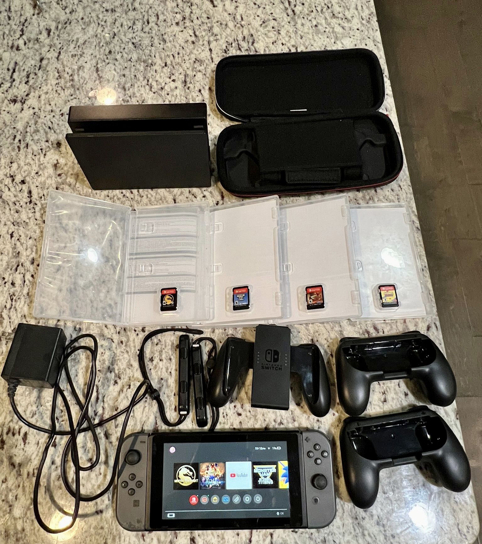 Good working Nintendo switch bundle with joycons, 4 games, charging dock and case.