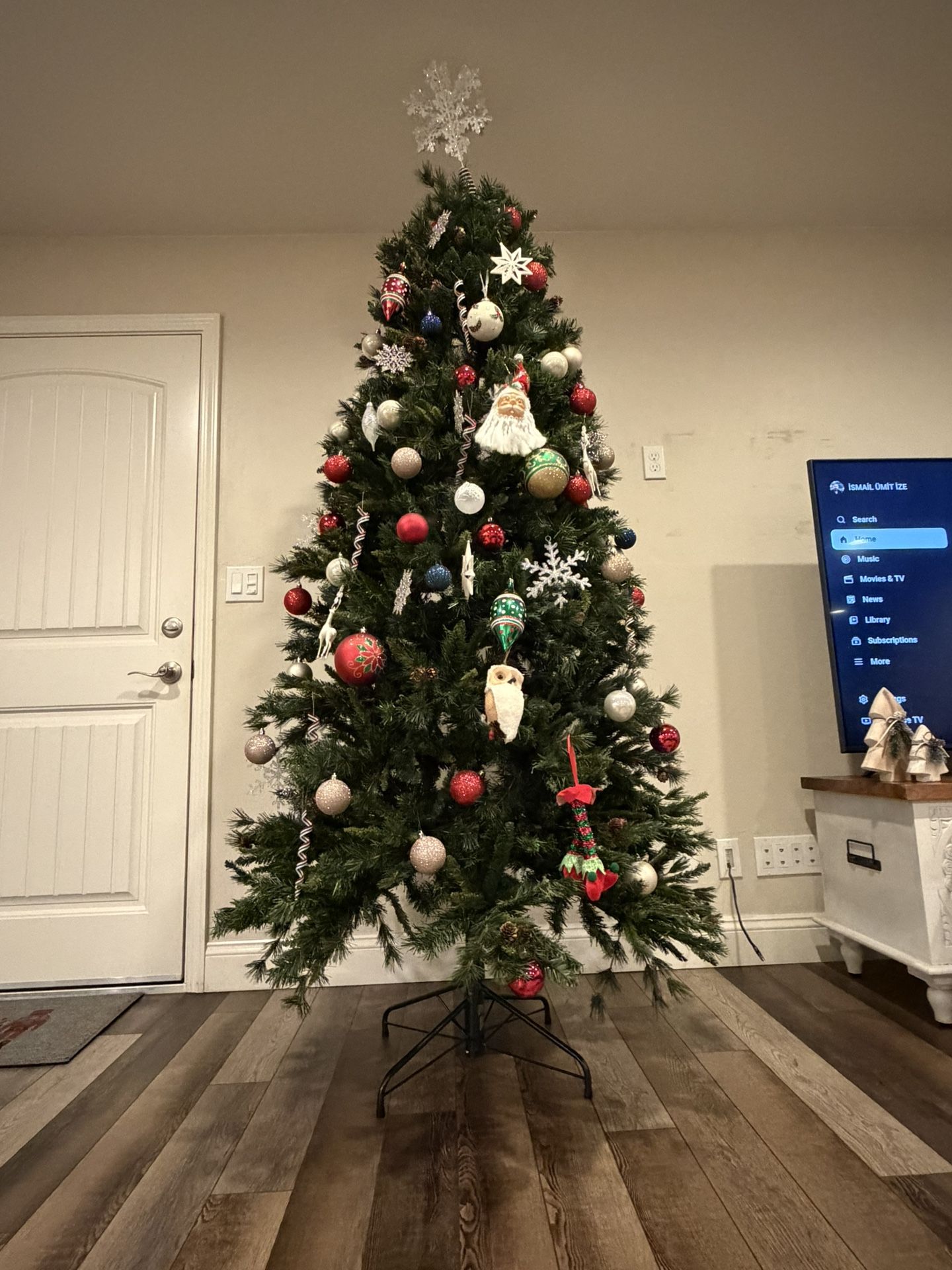 Christmas tree. With its Christmas decorations and 7.5 feet