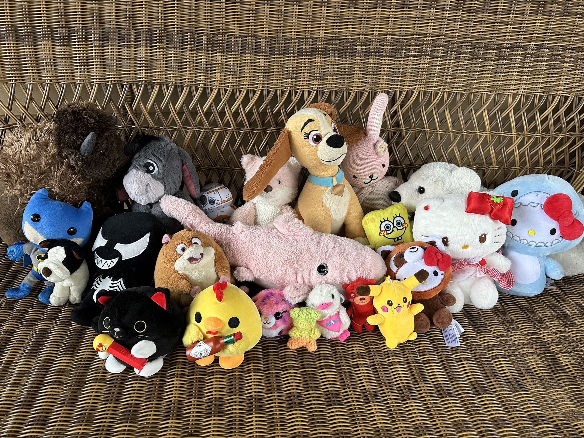23 stuffed animals - hello kitty, venom, Batman, SpongeBob, pikachu, Plushies
