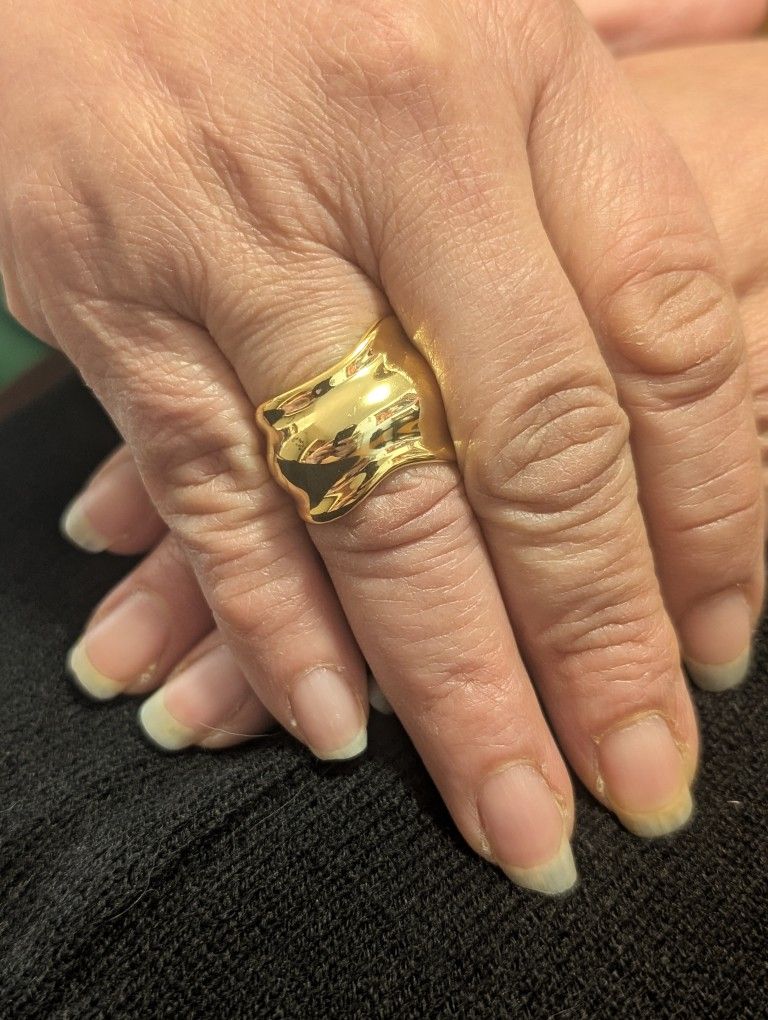 The Elsa Peretti Tiffany & Co Bone Cuff 18kt Yellow Gold Ring is a stunning piece of fine jewelry that features a natural bone cuff set in 18kt yellow gold. This signed ring from Tiffany & Co. is a band style with a minimalist design, making it a versatile and elegant accessory for any outfit. With its unique craftsmanship and luxurious materials, this ring is a timeless and sophisticated choice for those looking for a statement piece of jewelry. *Original Package is not included* $2000 OBO