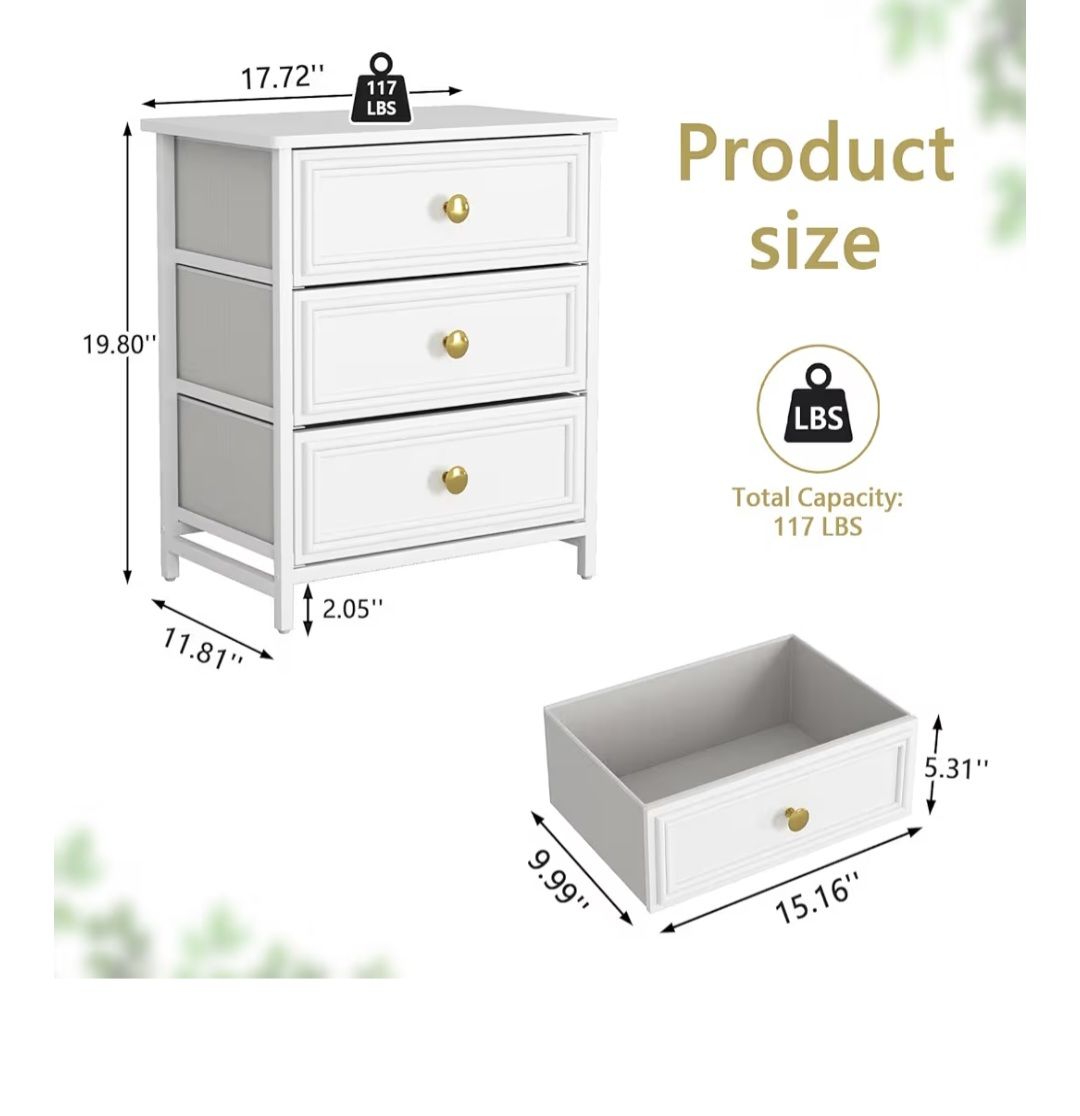 Fabric Drawer With Wood Front: This white nightstand has fabric drawers with wood front, elegant look and easy to clean, gold metal handle. Could be a nice small piece of furniture to be placed in easy-look place. Sturdy and Stable Construction: Exquisite engineered wood and metal frame combination, provide stable support. 4 adjustable feet keep leveling and avoiding scratching the floor. Easy to clean, wipe gently with a damp cloth, the bedside table with storage looks new. Large Storage Capacity : This modern nightstand with 3 drawers and a spacious tabletop gives you plenty of storage space. Enough to store your photos, books, lamps, mobile phones, alarm clocks and other daily necessities, keep your room organized. Versatile Night Stand Set Of 2: Warm night stands, can be used as a living room sofa side table, bedside table for bedroom, printer stand for study, hallway storage table. In addition, perfect combination with Resenkos computer desk, TV stand, vanity table and bookshelf.