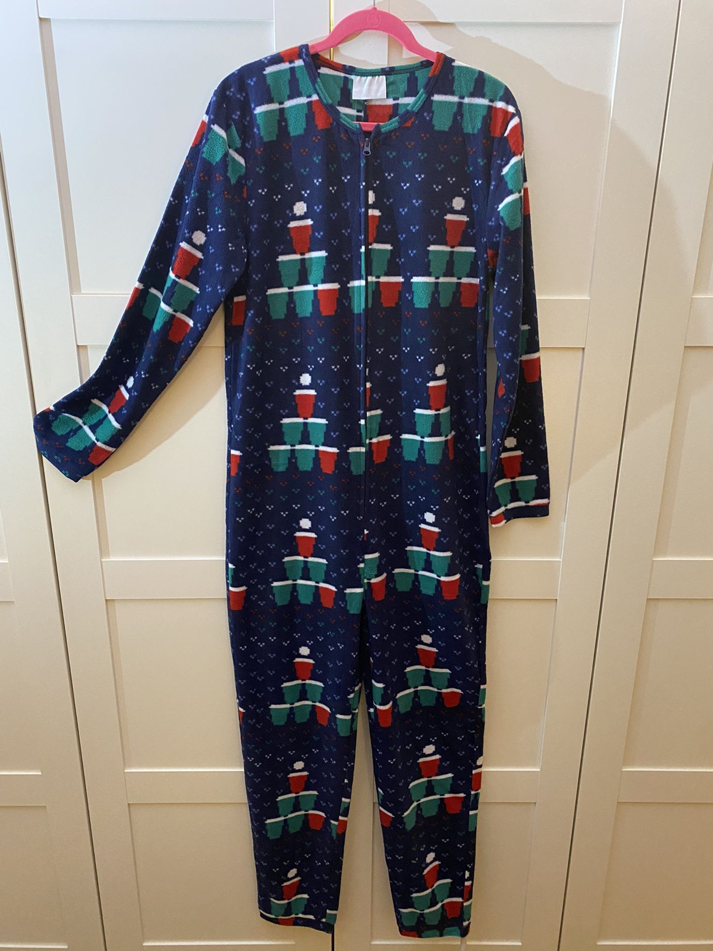 New adult Christmas 1 piece pajamas. Available in Medium or Large, limited quantities remaining. Brand New! Funny and comfortable pajamas for the holiday season.