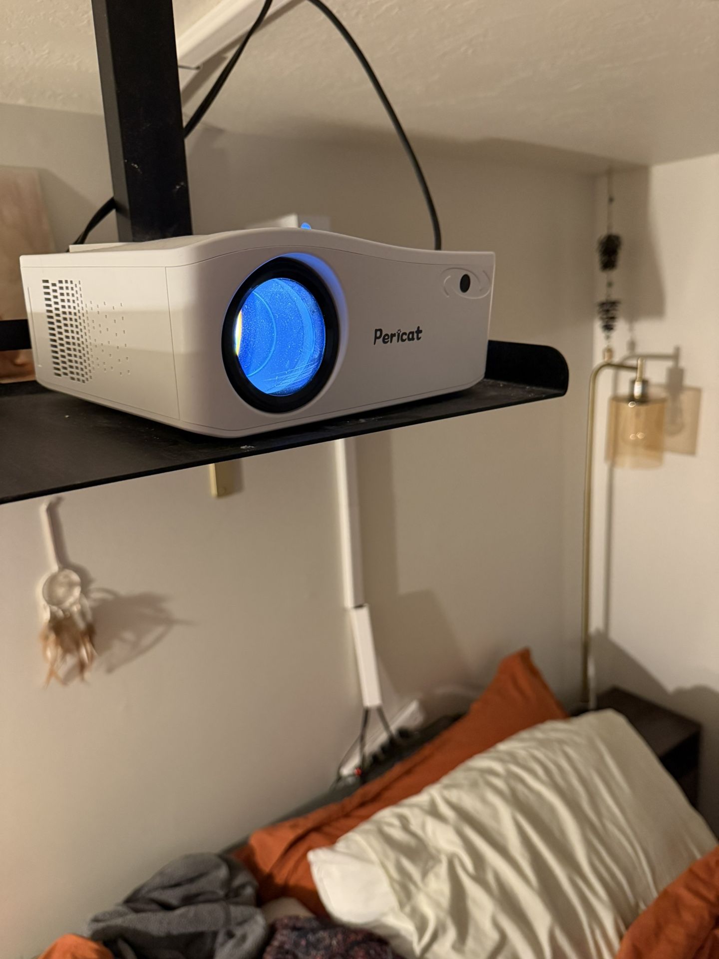 Pericat projector with 120” vivohome screen. Screen pulls down so it’s very discreet when not in use. Can be mounted from wall or ceiling. Projector is Bluetooth enabled and has HDMI hookup as well. Like-new condition, just prefer TV setup to projector!