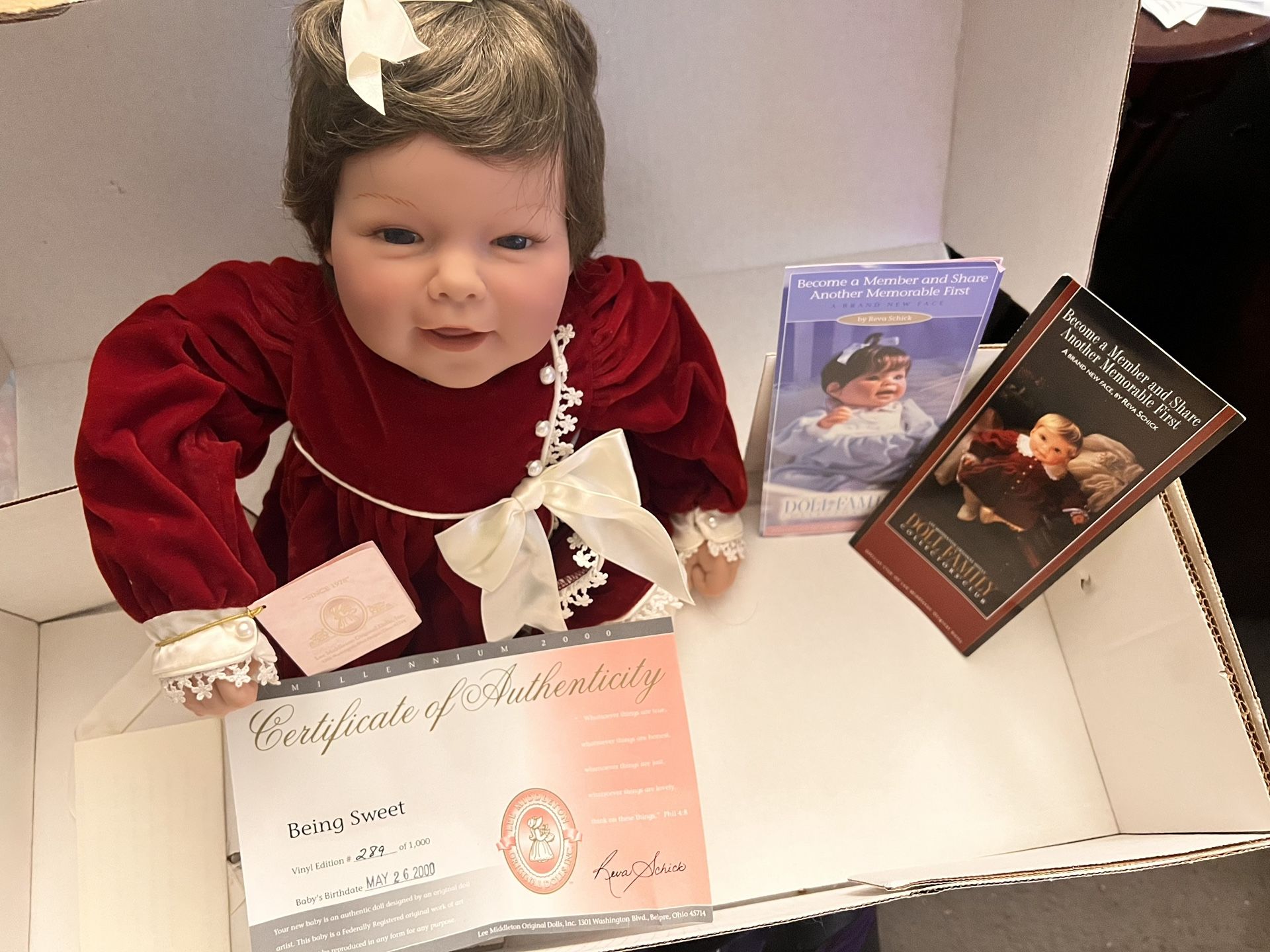 “Being Sweet” Lee Middleton Collector’s Edition Baby Doll. Dressed for the holidays. Doll and paperwork are in Like New condition. Box is a bit rough. Purchased at an auction years ago. They taped the box closed. Thank you for looking!!