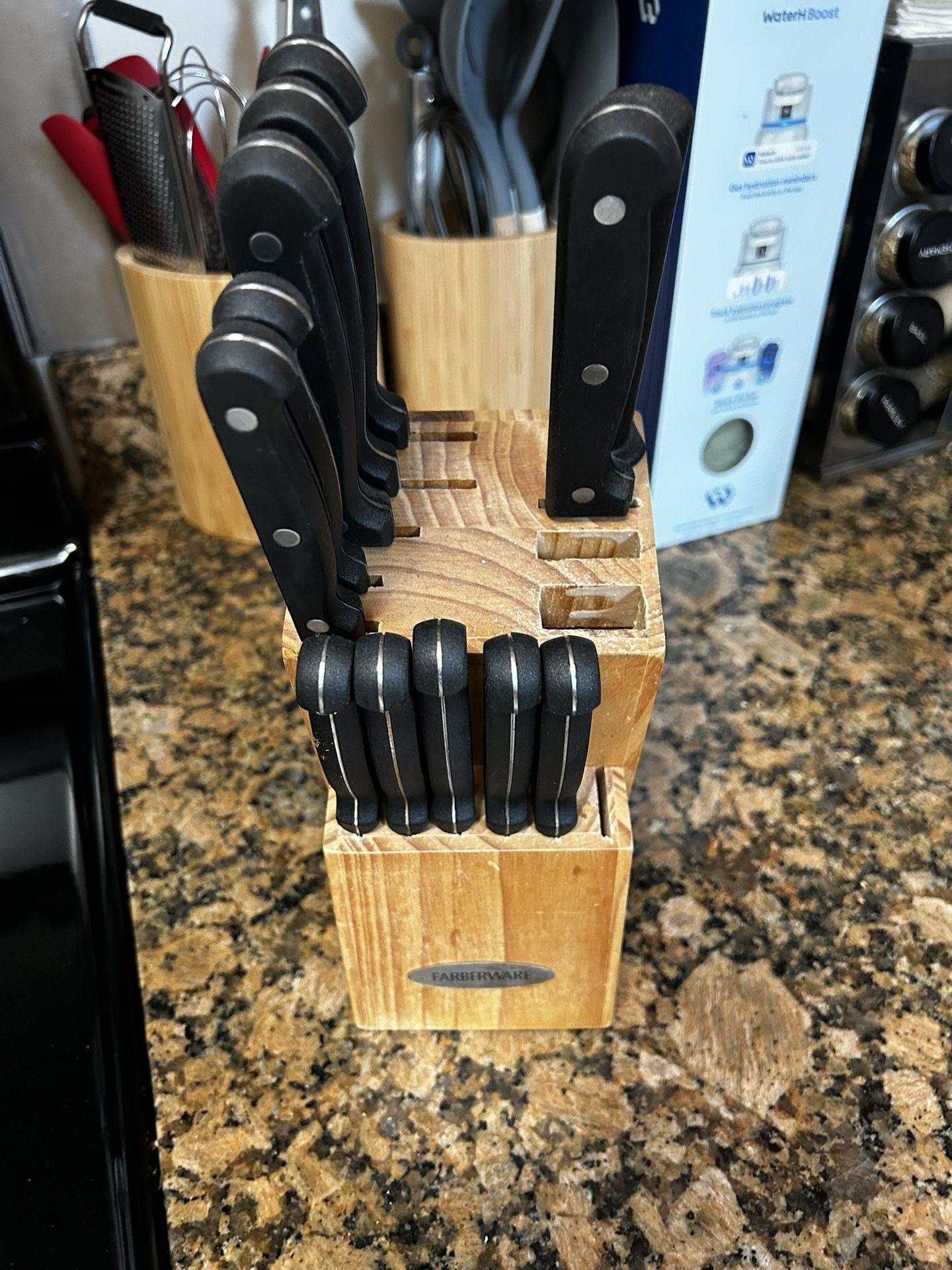 Faberware knife set and block. 17 pieces (although scissors and 1 table knife missing) triple rivet high carbon stainless steel set. Original price $42 Used but in good condition Pickup only. Can maybe meet in San Francisco