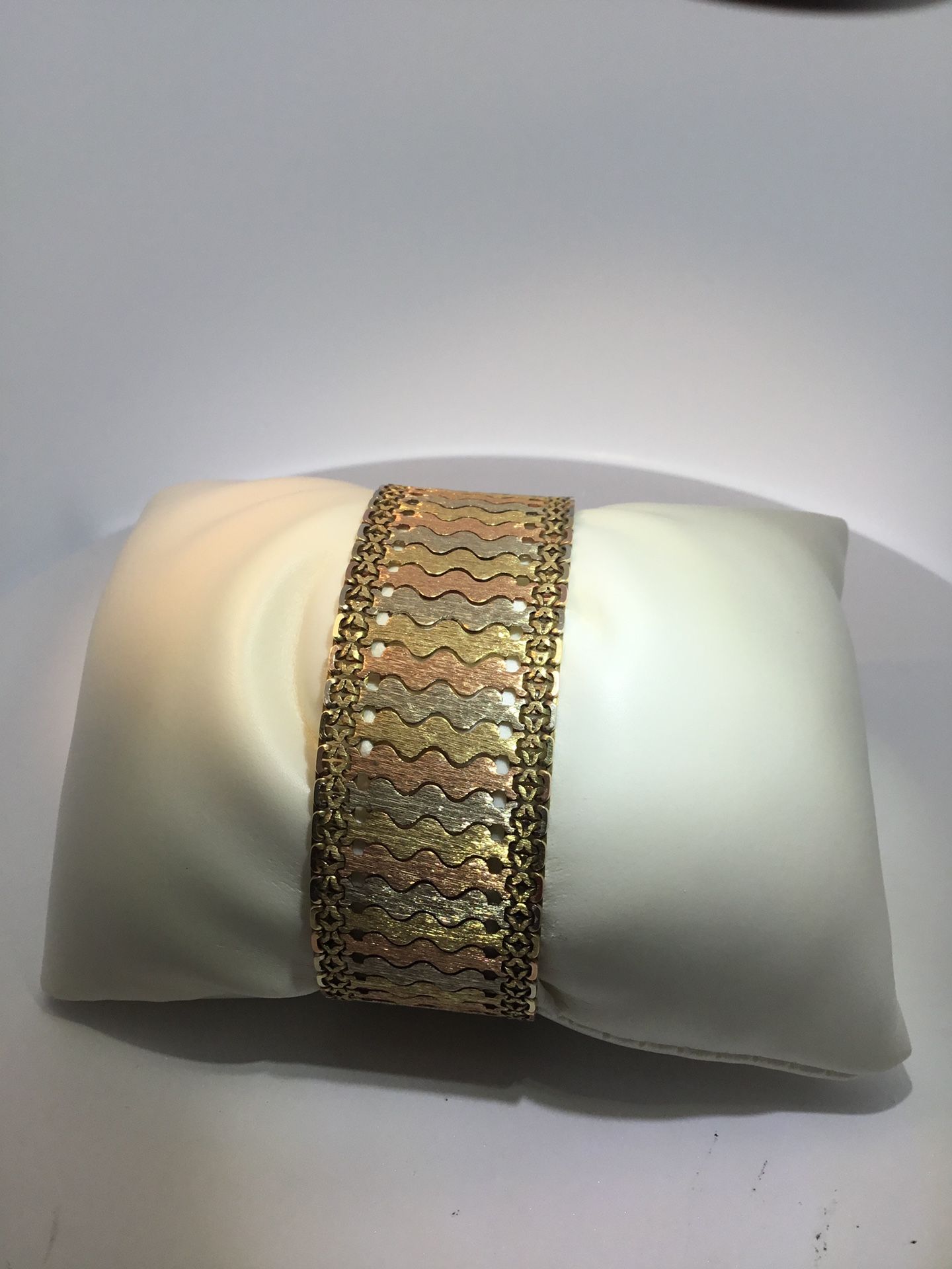 At only $11,800 An incredible value compared to your large retailers who sell this for over a &33,040 14K 3-tone lady’s gold fashion bracelet Instant financing $0 down. Only $507 a month on this one. OR take advantage of our old fashioned layaway with never an interest charge. You can also trade in your jewelry towards something new. We will even pay you cash for your unwanted jewelry Come Buy today Diamond Jim's jewelry 10001 W. Bell Rd. Ste #127 Sun City, AZ 85351 South west corner of 99th Ave. and W. Bell