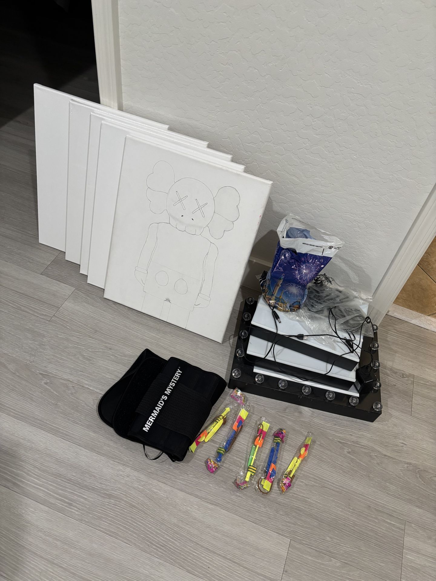 It was just stored away but selling everything for $20 Only 1 canvas is used on the other ones are new