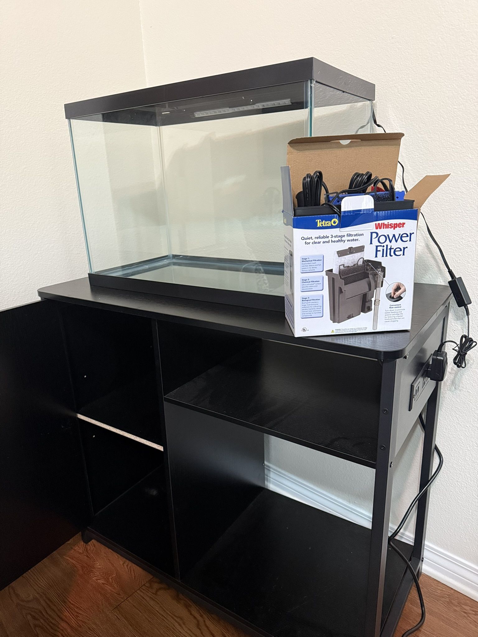 Never been used I thought I wanted fishes but it’s more responsibility than I thought. No scratches on table or aquarium. Never used. It’s now just taking up space. Unopened fish decorations. Has everything you need except the fish. Tank changes colors. Table has outlets and cabinet. [Suitable for 40-50 Gallon Aquarium) The top dimensions of the fish tank stand are 35.4"L x 17.7"W, designed to accommodate a 40-50 gallon aquarium with a weight capacity of 440 pounds.
