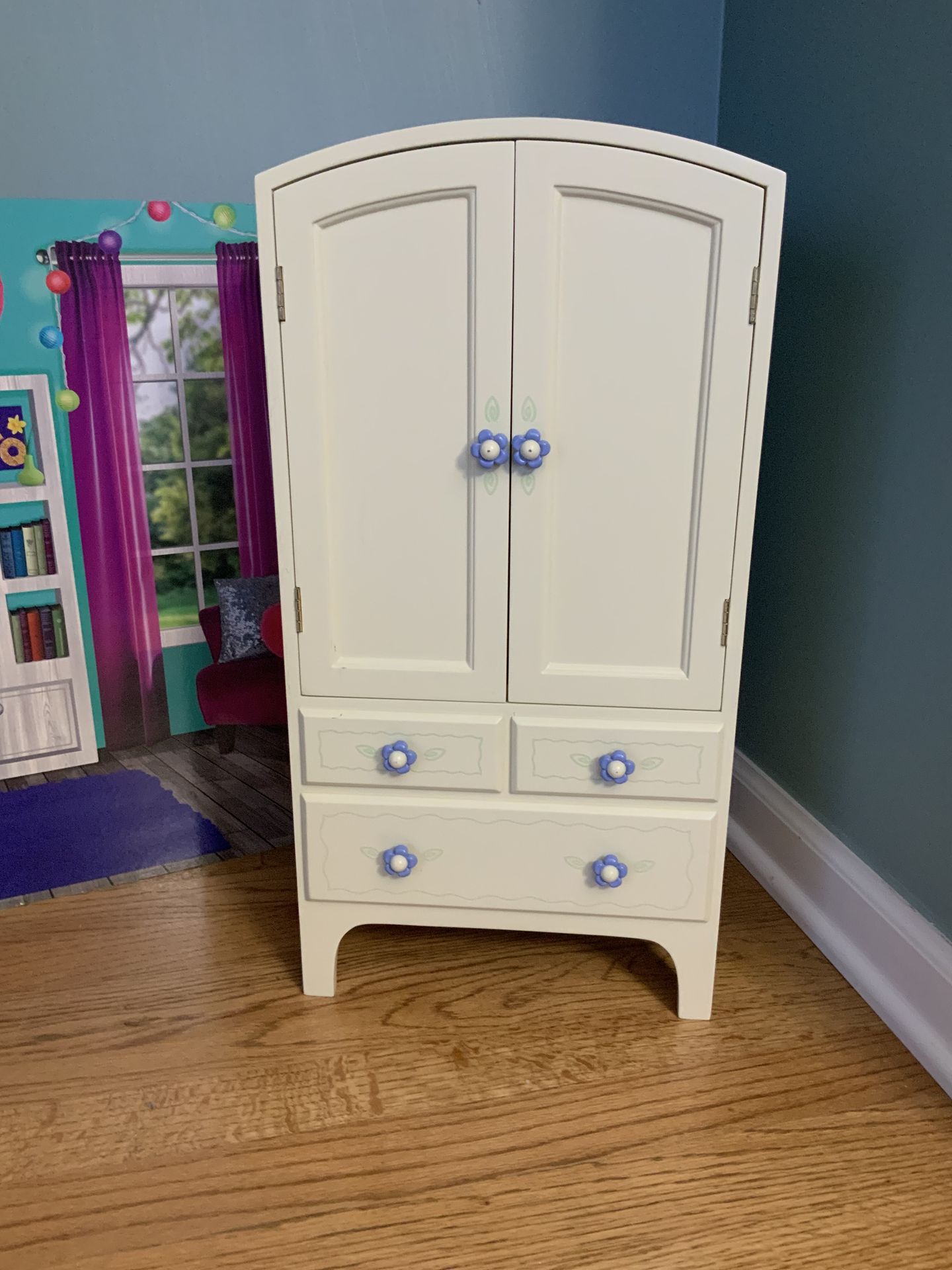 American Girl Wooden Doll Armoire – Sage Green (Early 2000s) For sale is a genuine American Girl wooden doll armoire, sized for 18-inch dolls. Solid wood construction with the classic sage green finish and blue flower knobs. Matches my trundle bed listing. Features: • Double opening doors • Interior hanging rod * 3 Metal Hangers included • Oval interior mirror with blue frame • Three lower drawers • All doors and drawers work properly • Clean, solid, and display-ready Condition: Good overall condition with normal age-related wear. Please note: • Minor cosmetic paint wear on the back upper edge (not visible when displayed) See photos. This wear is cosmetic and does not affect use. Price: Asking $85 To show display only—This price does not include the American Girl Harry Potter Outfit. Local Pickup preferred due to size.