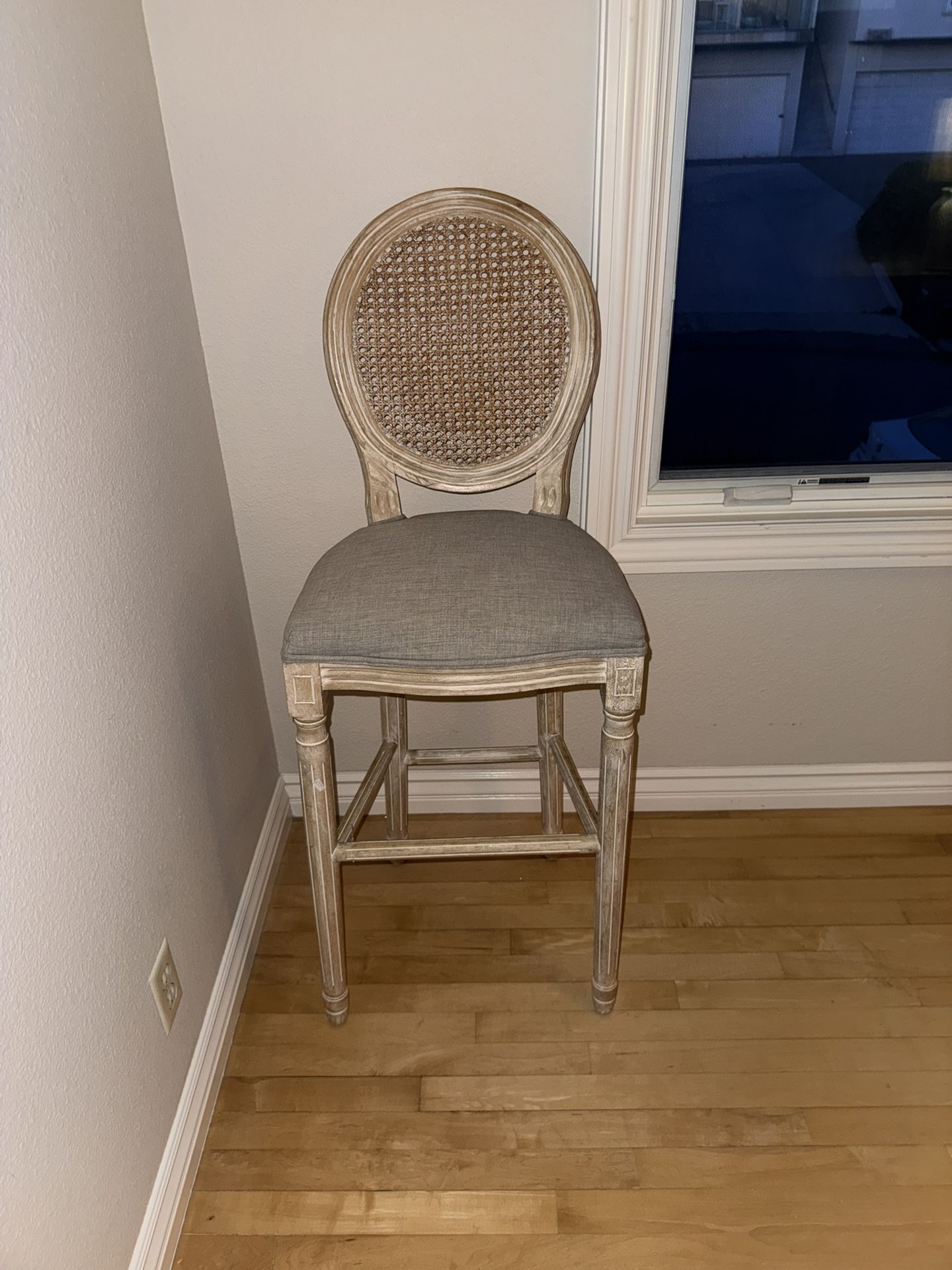 • Set of 3 counter stools • French / Louis style design • Round cane backs with carved wood frame • Light distressed wood finish • Upholstered linen seats • Seat height - 29 in • Seat width - 14 in • Overall width - 18 in • Back height - ~22.5 in • Solid wood construction • Comfortable padded seats • Works for kitchen islands or bar areas • Excellent condition • Clean, no damage • Barely used
