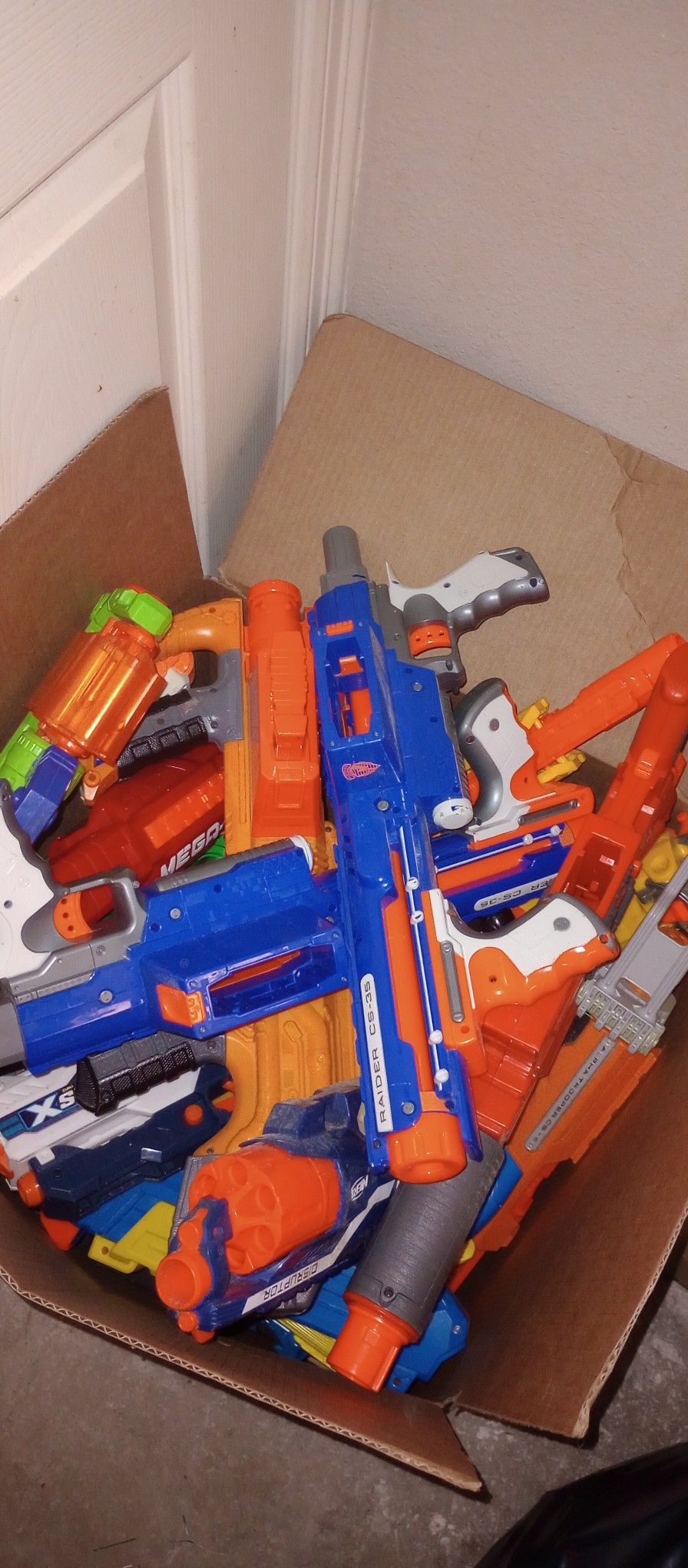I'm selling a huge box containing more than 50 large, medium and small Nerf guns. Have not tested every single one of them.