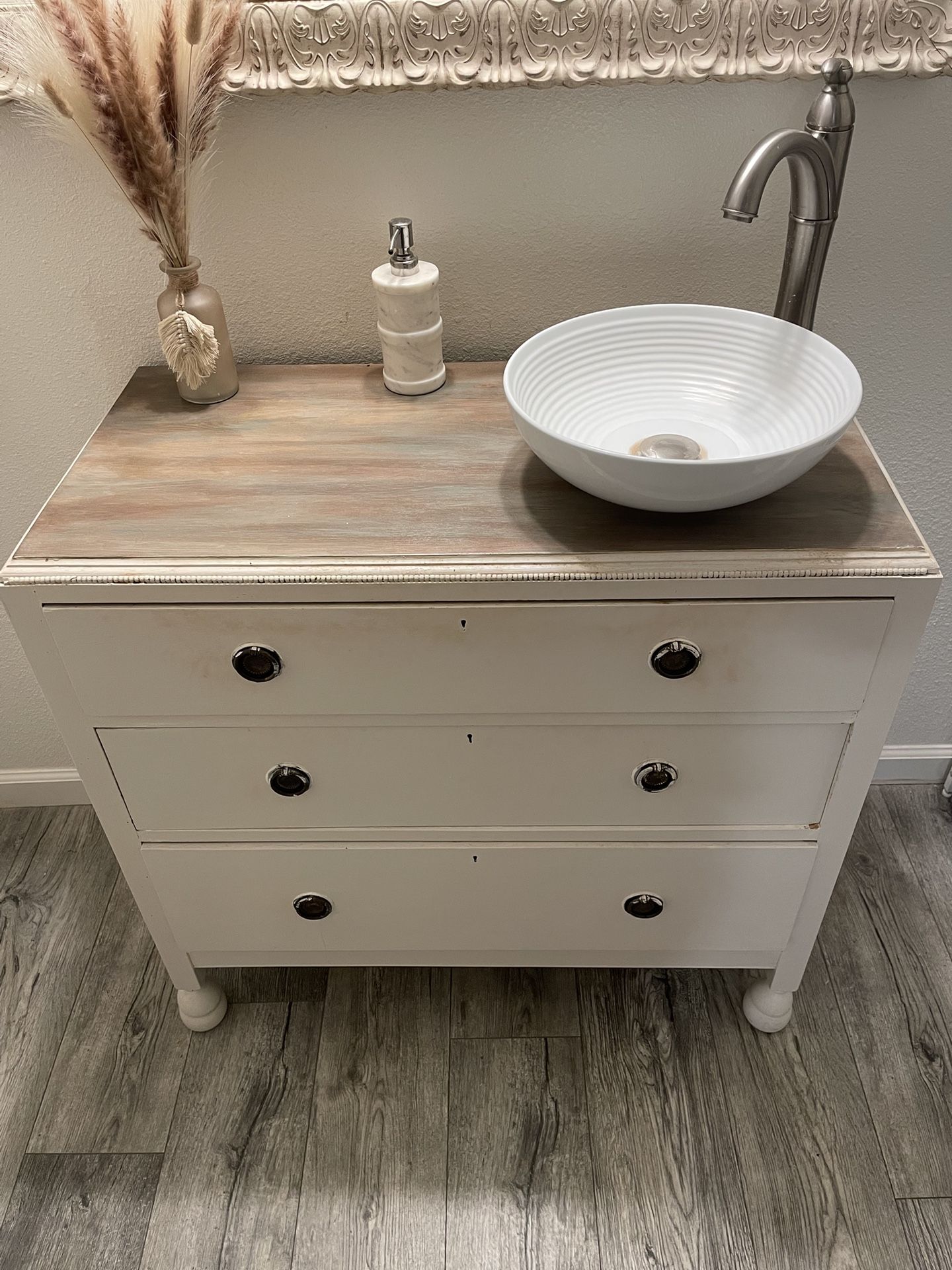 Beautiful vanity ready to install. The drawer has been cut and refinished to fit around the drain line. Very nice piece for your bathroom!