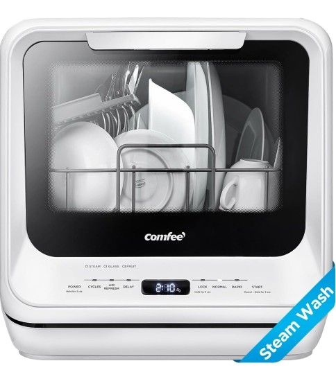 RRP $350 COMFEE' Countertop Dishwasher, Portable Dishwasher with 5L Built-in Water Tank, No Hookup Needed, 6 Programs, 360° Dual Spray, 192℉ Steam& Air-Dry Function, Mini Dishwasher for Apartments& RVs, White Great Condition Please make sure the distance between your countertop and wall cupboard is more than 19.6" [【No Installation Needed】: Adding water manually in the 5L built-in water tank, you can put the countertop dishwasher in any suitable place without connecting to tap water. This mini dishwasher can also be hooked to a kitchen faucet with the included water hose (Faucet Adapter Needed)..Water pressure : 0.04 - 1.0MPa..Water pressure : 0.04 - 1.0MPa [ Ultra-Compact Design ]: The compact dishwasher can wash 30+ items (Max to 10" plates) at a time while occupying a small space (16.5 x 17.1 x 17.1 inches), ideal for apartments, small kitchens, dorms, boats, campers& RVs. (Note: COMFEE' dishwashers are tested at the factory before being shipped, so it's normal if your new tabletop dishwasher has some water inside.) [ 6 Programs ]: NORMAL, RAPID, STEAM, FRUIT, GLASS washing programs, and AIR REFRESH extra drying mode meet all your daily needs. Note: use the standard dishwasher powders or detergents to get the best cleaning results. (No detergent is needed for the FRUIT program, and RAPID just needs half of the standard quantity. Regular liquid dish soap will cause dishwasher problems). 【Upgraded 215 ℉ STEAM & Dual Spray】: The STEAM program includes 162 ℉ Rinsing and max to 215 ℉ STEAM, easily removing stuck-on and dried food particles than regular programs. It also ensures thorough cleaning of baby bottles. The upper and lower spray arms direct water toward the corners of every dish, turning dirty dishes sparkling clean. [ Extra Drying & Stay Fresh ]: Circulation of AIR REFRESH removes moisture and odor, keeping your plates and machine dry and fresh for a long time. The function is enabled by default and you can also inactivate the function if unnecessary. [ Lower Water & Energy Consumption ]: The COMFEE' Eco-dishwashing cleans dishes with less effort. It only consumes 5L of water per wash cycle, only 1/3 the amount used when handwashing and it uses only 0.35 kilowatt-hours per year. [ Intuitive & Safe Operation ]: LED Digital Display, See-Through Viewing Window, Child Lock, and Leak Protection allow for an easy and safe operation.