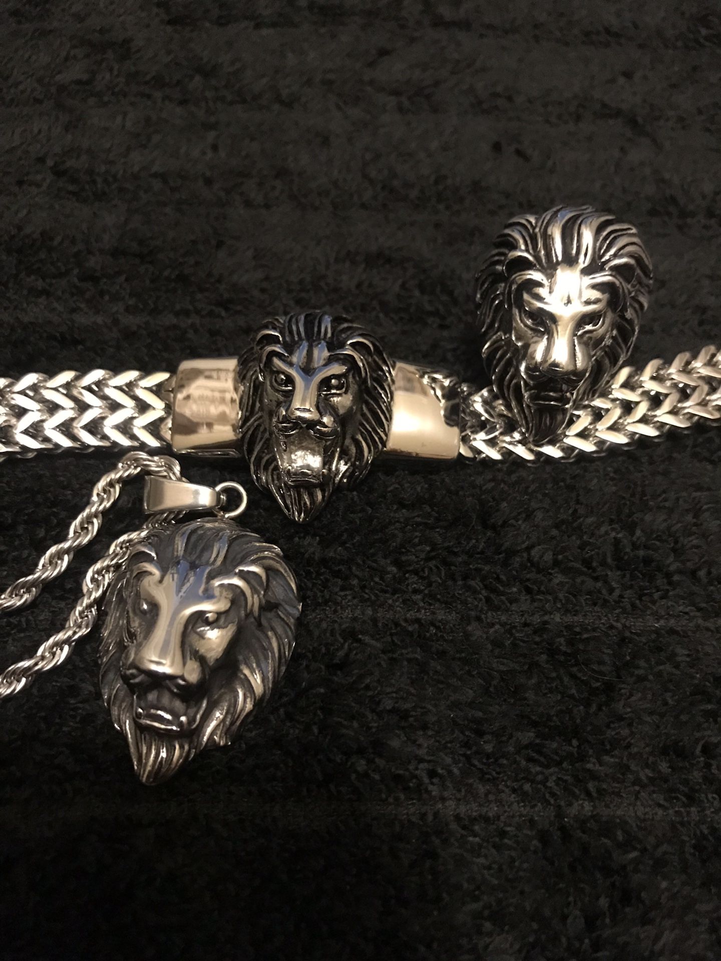 All stainless steel. If you love lions , then this set is definitely for you , your ass in luck. Never used all new , not a scratch on it. The bracelet is nice and super shiny as the rest , but stands out the most and it’s pretty thick man. Will sell fast I promise it’s beautiful.