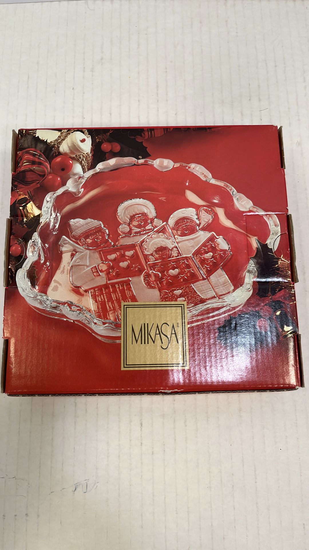 Brand: Mikasa Pattern: Christmas Carolers (Model SA 987/210) Material: Clear crystal glass Dimensions: Approximately 8 1/4 inches Features: Oval shape with a scalloped edge and raised design Box 3
