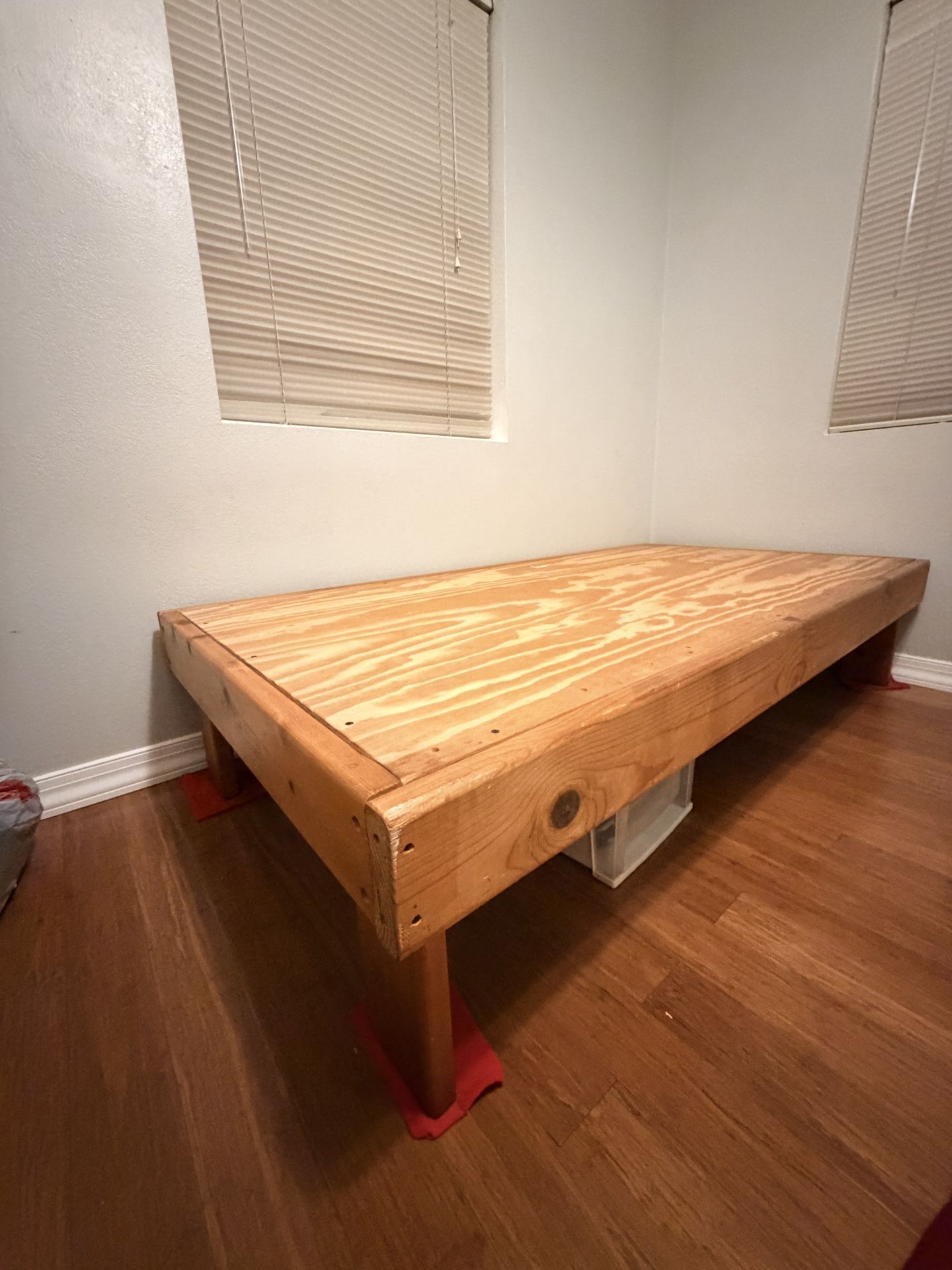 Very sturdy and well-built wooden bed frame with a simple design! Frame cannot be disassembled and must be transported as is. We have a twin mattress in fair condition (as pictured) that you can have for free if you need a mattress as well. Pick up in Pasadena, 91107