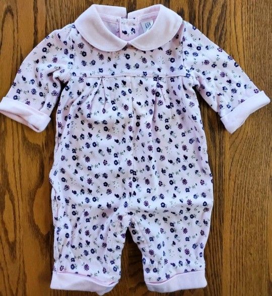 BABY GAP Girls 0-3M Pink Long Sleeve Collared Romper with Purple and gray floral print. Romper has pink collar and pink cuffs at arm and leg openings. Two button closure at top back of romper. Snap closures at legs and crotch. Romper is a lovely soft 100% cotton. Romper has been well-taken care of and is in "Just-Like-New" condition. Romper has been freshly laundered for you!