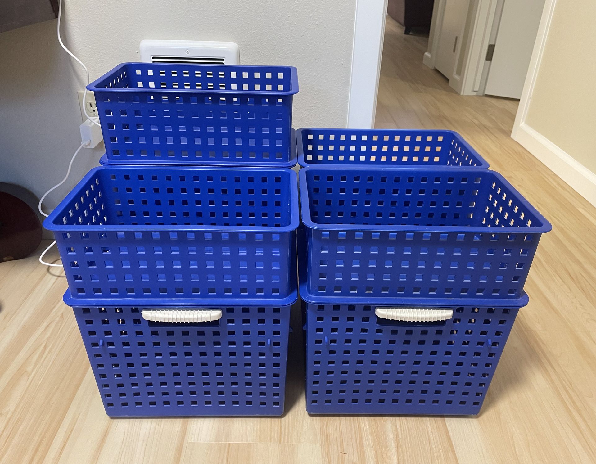 Stackable Storage Bins From Extra Space Get organized 2026 with these stackable storage bins/ modular storage system by InterDesign from Extra Space. 5 each of the medium bins measure 8 1/2” x 13 1/2” by 5” deep. The 2 larger bins have handles and measure 17 1/2” x 13 1/2” and are 10”s deep. Selling the set of 7 bins for $45.00