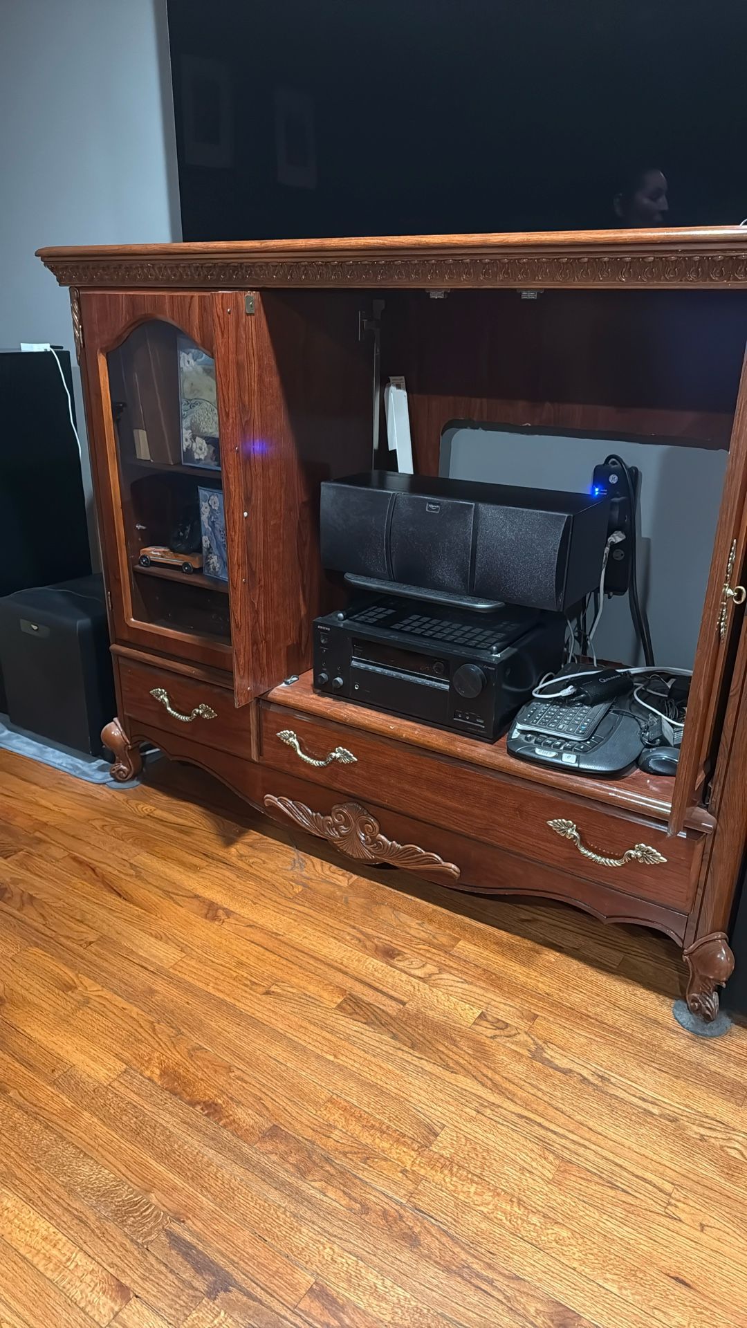 $200 OBO 2 bottom drawers. Left side cabinet with glass door. 2 sliding/disappearing space for TV H 55in x L 65in x W 21 1/3in