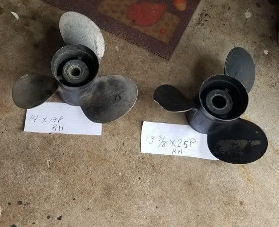 2 Quicksilver propeller 14 X 19P and 13 3/8 X 25P. $70 for the 14 inch and $40 for the 13 3/8 has a dent. Both RH.