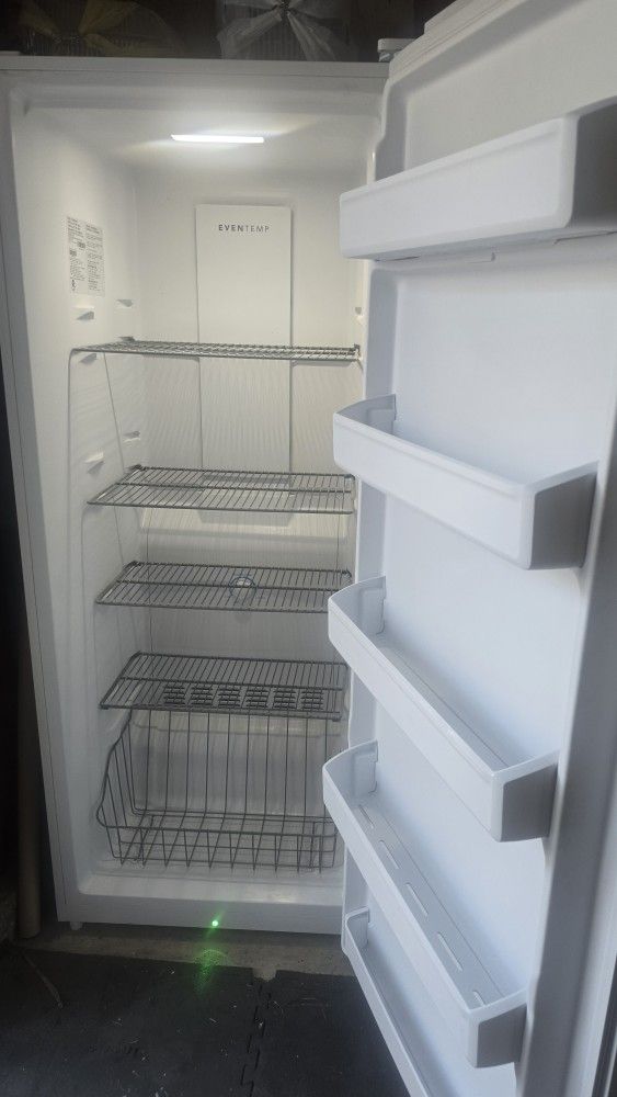 Spacious Frigidaire FFFU13F2VW upright freezer. White color. Has wire shelves inside and door storage. Also has a wire basket at the bottom. Manufactured November 2023. Like New. Works great.