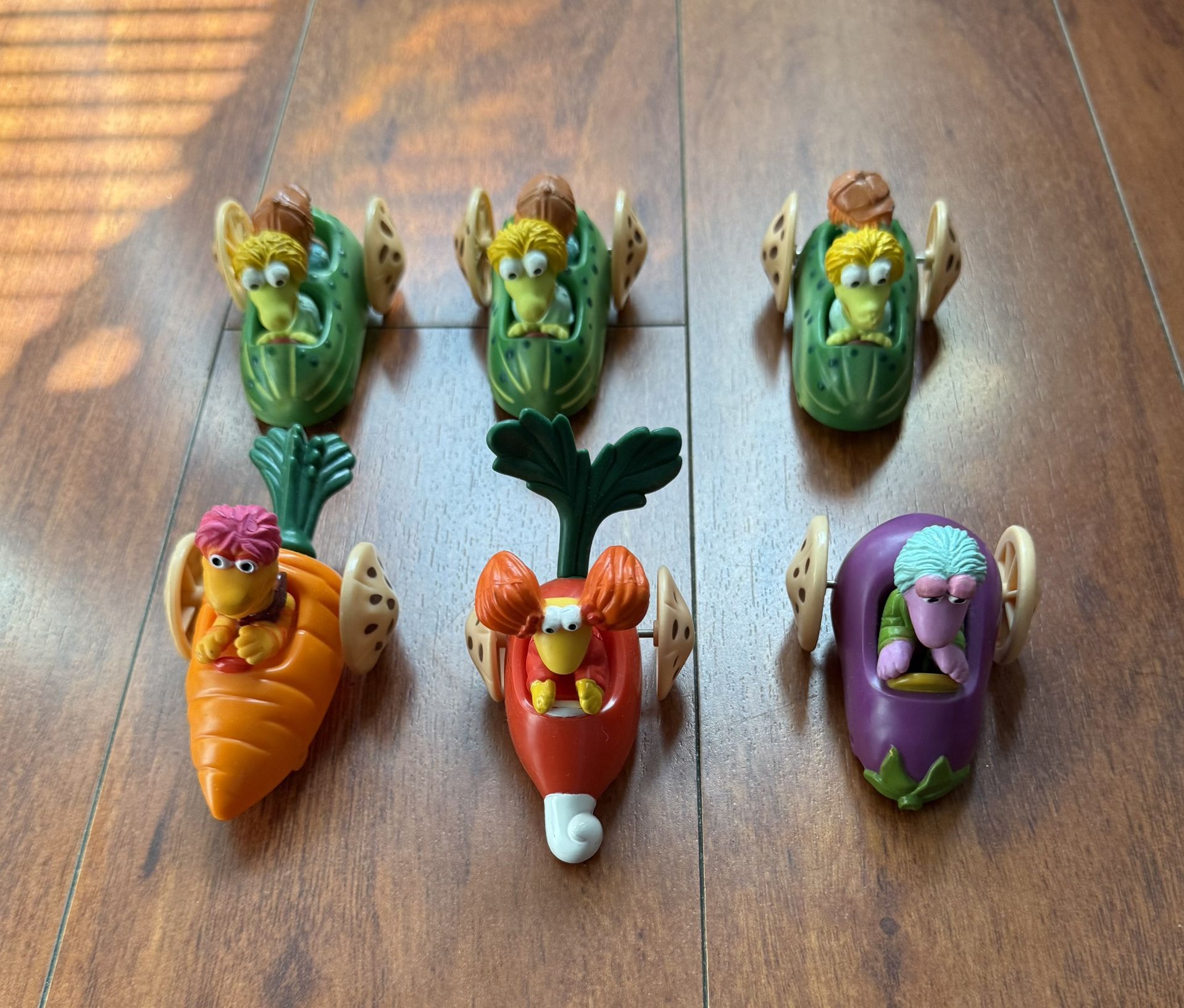McDonald’s Happy Meal Toys FRAGGLE ROCK toy cars set of 6 Great condition COMPLETE set of FRAGGLE ROCK character toy cars. ALL 6 toy cars for $5 There are 2 duplicates of the cucumber car. Check out listing for more classic toys character plushes and figures. :)