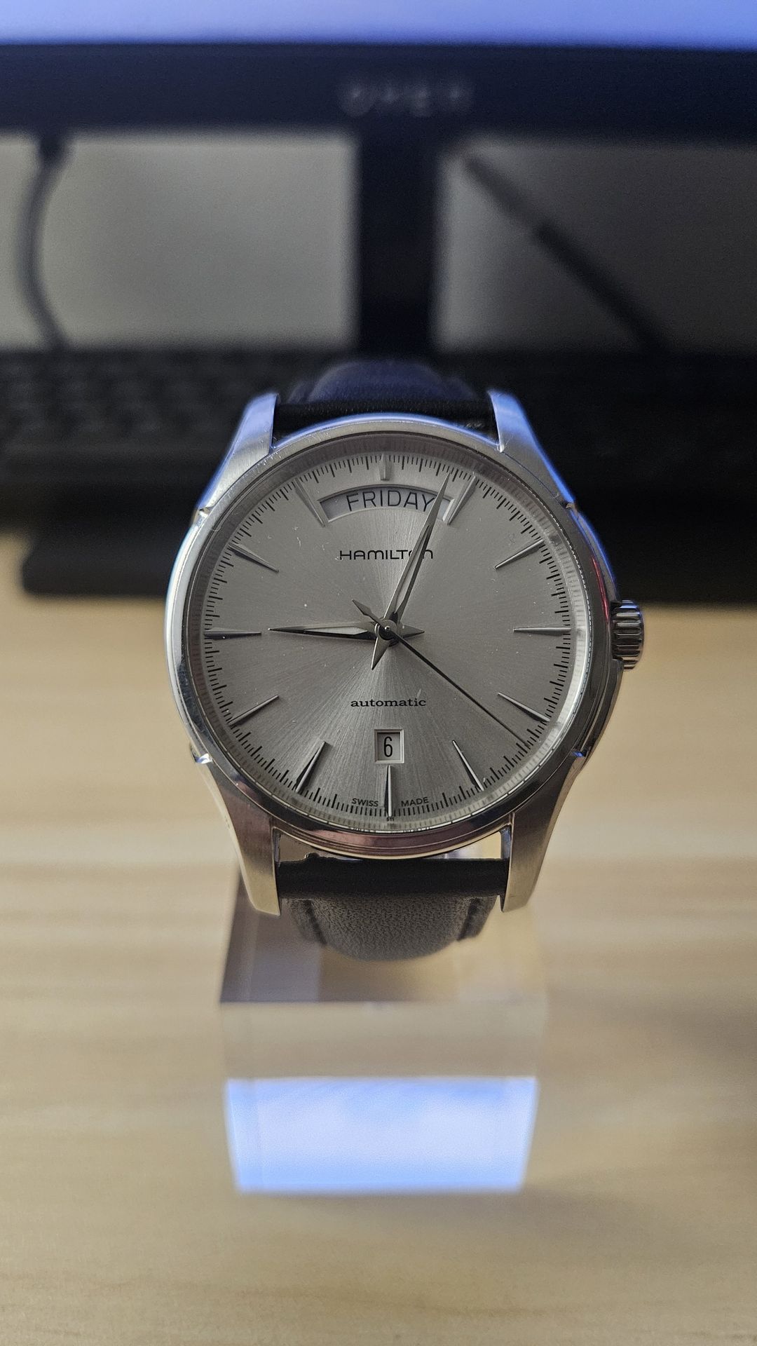 Hamilton Jazzmater Day Date Ref# H325050 Condition: Very Good Type: Automatic/ Mechanical Dimensions: 40mm width, 11.5mm thick This is an older slightly smaller model of the Hamilton Jazzmater Day Date. The dial is all silver with an open caseback. Comes with a day of the week window at 12 and date of the month window at 6. Has lume on the hands. Has a temporary replacement calfskin strap. Comes with original clasp and buckle. Message me if you're interested. I'm open to offers.