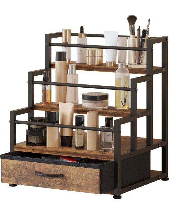 ALREADY ASSEMBLED!! 3-Tier Cologne Stand with Fabric Drawer, Cologne Organizer for Men, Spacious Wine Rack,Coffee Syrup Stand for Kitchen, Bathroom & Bar Counter Décor Material: Metal Color: Brown Special Feature: Detachable Product Dimensions: 13.4"D x 13"W x 13.4"H Shelf Type: Tiered Shelf Number of Shelves; 3
