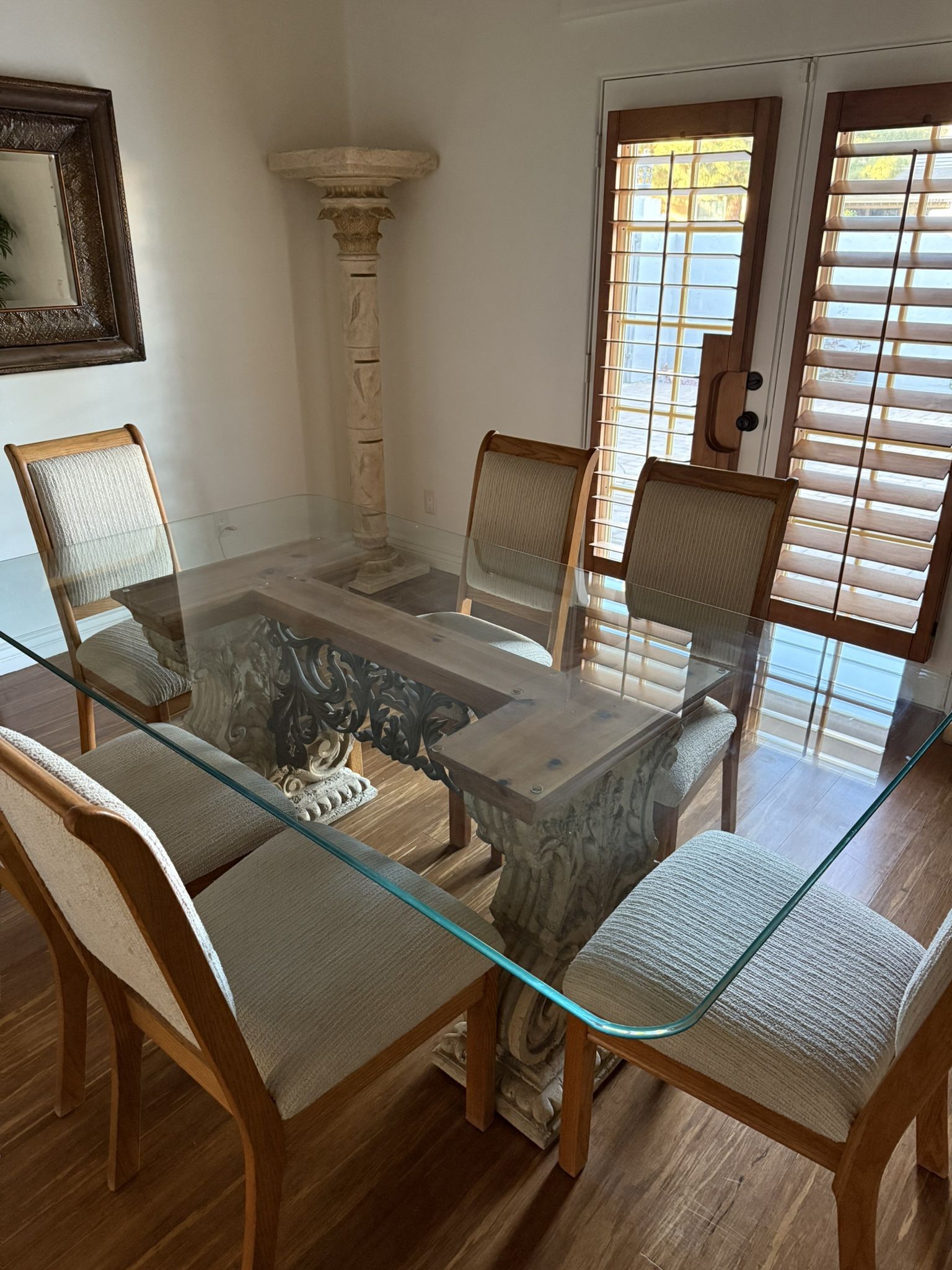Selling a 6 seater dinning table from Spain! This has been imported from Spain. The columns are rock and were hand crafted. In the middle is a black metal floral designing holding the rocks together and the top wooden platform. Thick dinning glass 80in wide. 6 seats that are like new. We only had this as a showpiece, rarely used. Very unique style, with handcrafted rock and metal bound. I had payed $3.5k importing this over. Selling for half of that, $1.8k. Pickup only. IF needing to drop off close by it will be $100 fee, and will need to deposit it prior.