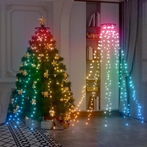 Multicolor Christmas Tree Lights with Ring, 8.2Ft 10 Line 200 LED Green Wire Warm White String Lights Plug in, 8 Lighting Modes, for Indoor Tree