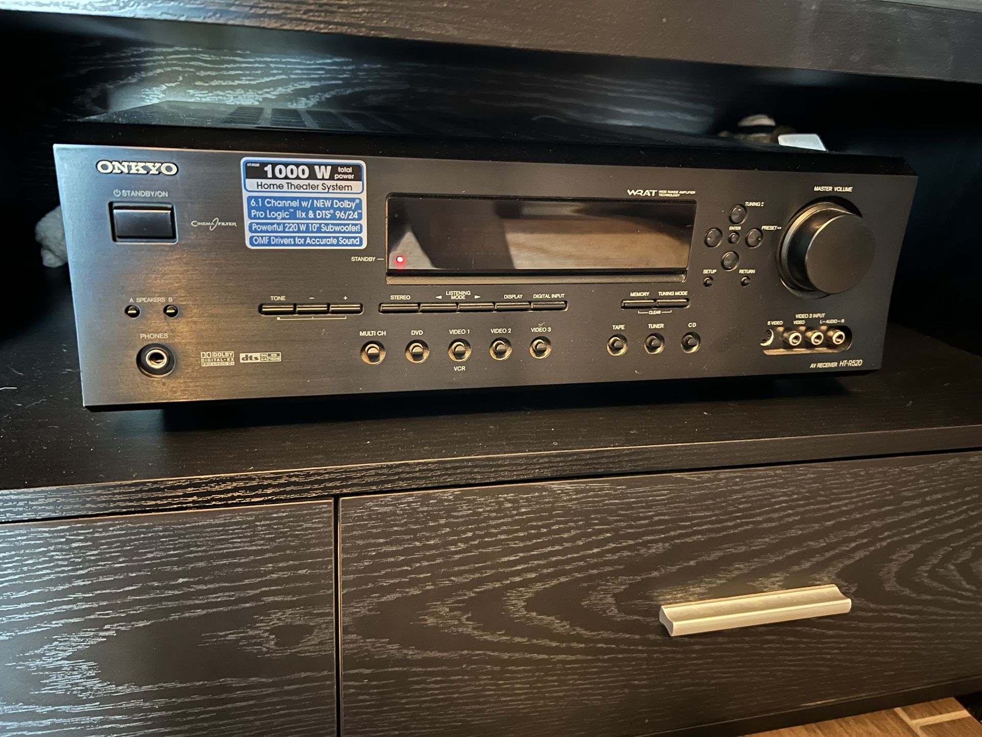 ONKYO thousand watt home theater system six. One channel with new Dolby prologic comes with everything you see in the picture.