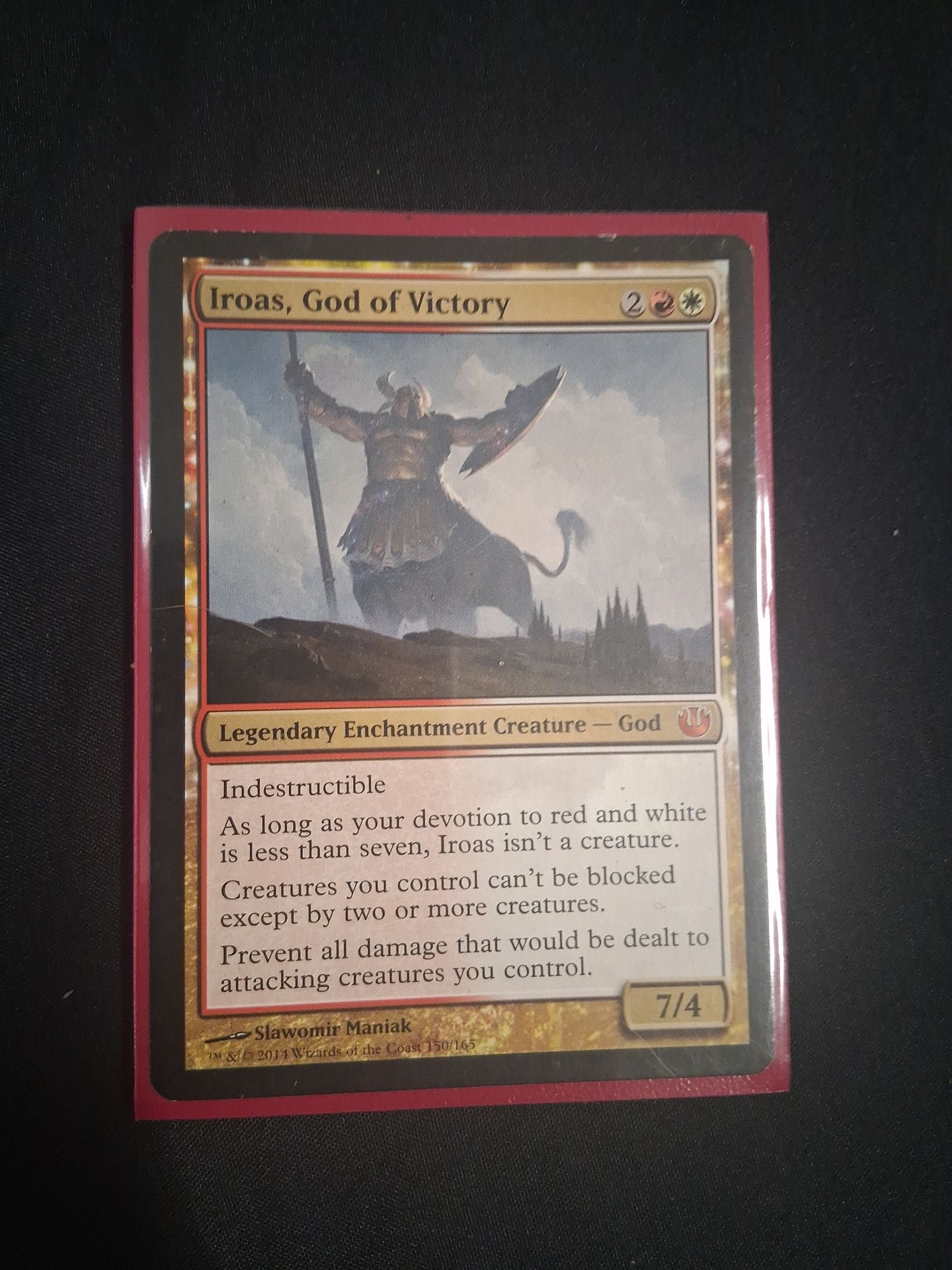 Iroas, God Of Victory 2011 Indestructible as long as your devotion to red and white is less than seven iroas isn't a creature Creatures you control can't be blocked except by two or more creatures Prevent all combat damage that would be dealt to attacking creatures you control Near mint