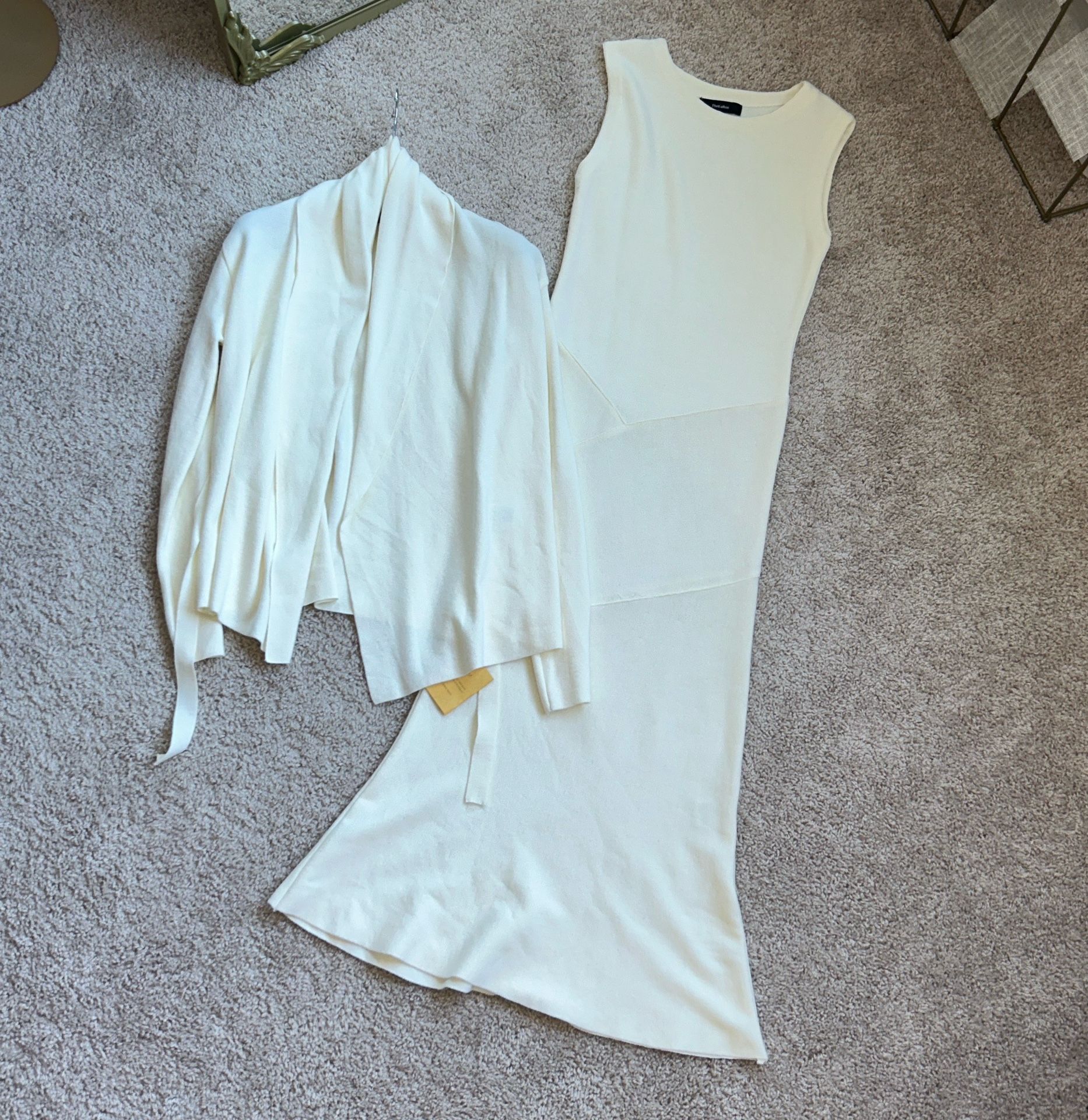 Nwt. In perfect new condition. Premium quality 2 pc dress and cardigan set in Ecru. Size Xs. The dress is sleeveless and can be worn with other tops and looks really nice. Dry clean only. *Cardigan measurement- length 22”. Sleeve 21.5”. Pit to pit 17”. Shawl collar style. No closure. The waistband that is attached can be tied to the front or back. *Dress measurement -length 49”. Pit to pit 14”. Stretches up to 20”. Shoulder 13.5”. Hips 13”. Stretches up to 18”. Unique seem line around hips tightly hold the tummy and butt so the dress doesn’t loosen as time goes by, Keeping its tight shape. Great versatility item. Retail $280